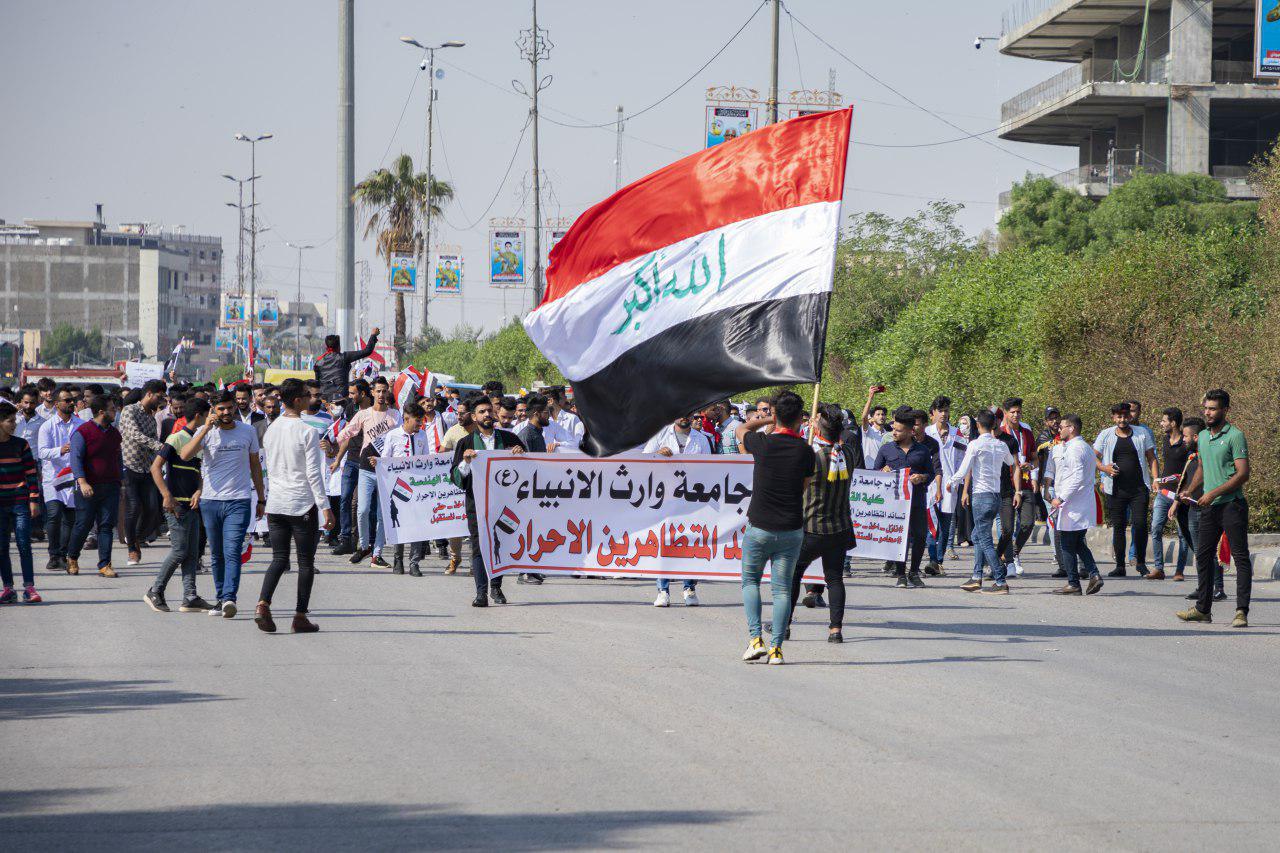 جانب من المسيرة التضامنية لأساتذة وطلبة جامعة وارث الأنبياء(عليه السلام) الداعمة للتظاهرات السلمية في محافظة كربلاء المقدسة