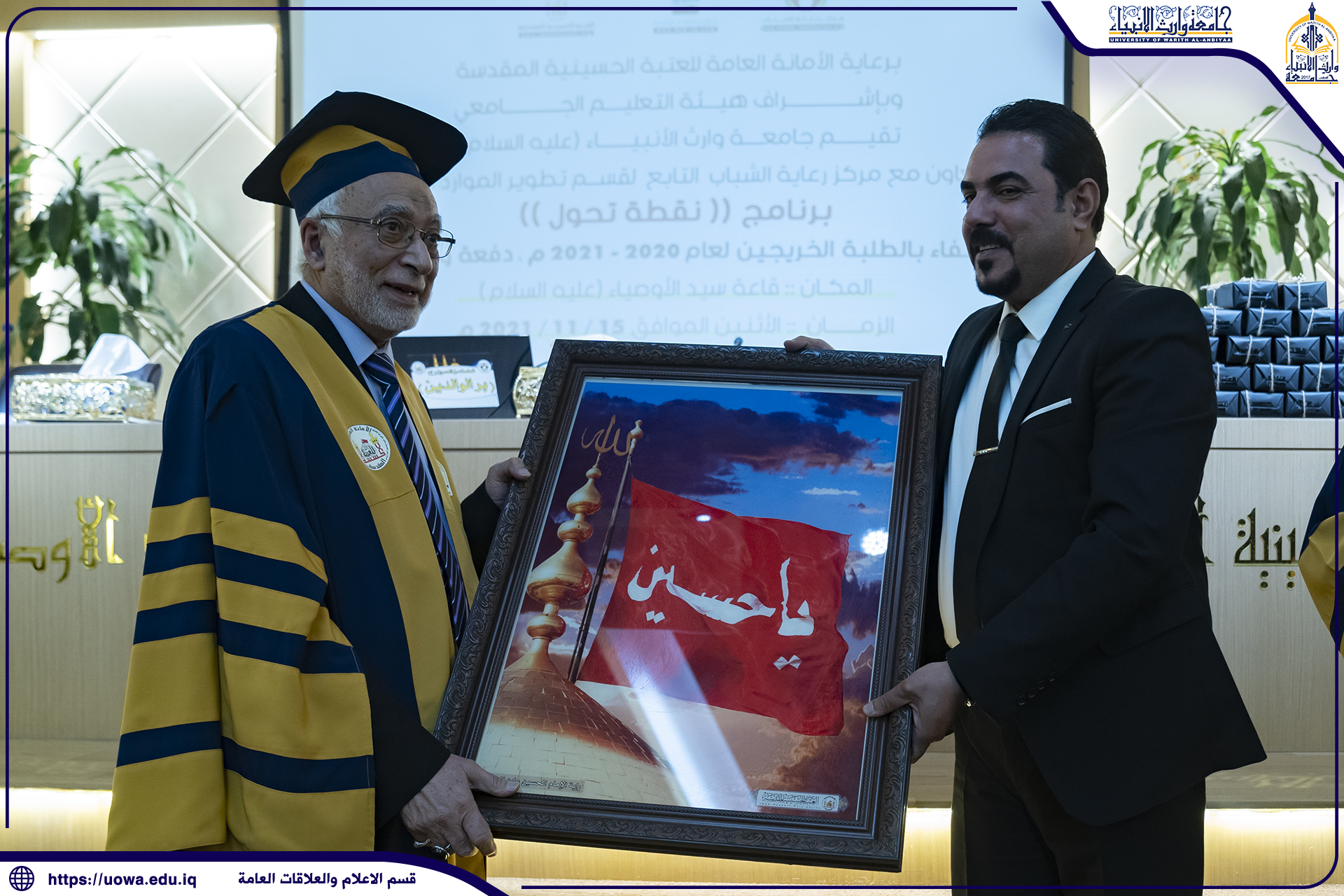 وجرى الحفل البهيج في قاعة سيد الأوصياء بالصحن الحسيني الشريف، بحضور السيد رئيس الجامعة الاستاذ الدكتور طالب حسن موسى والسادة مساعدي رئيس الجامعة والسادة عمداء الكليات واعضاء هيئة التدريس واولياء امور الطلبة .