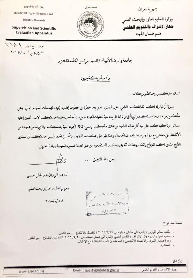 قدم الاستاذ الدكتور عبد الرزاق العيسى عبر كتاب رسمي مُباركة لنشاط جامعة وارث الانبياء الذي أعده نشاطاً غير تقليدي في خطواتها نحو ضمان الجودة والأداء الجامعي من خلال قيامكم بأسبوع ثقافة الجودة وتأكيدا على مبدأ الرصانه العلمية التي تتماشى من رؤية ورسالة واهداف الجامعة، وبين انه خطوة من خطوات ادارة الجودة لمؤسسات التعليم العالي ، وعبر الاستاذ الدكتور عن أمله في ان تاخذ الجامعة الريادة في خطوات الجودة ضمن مبدأ صاحب خيمه الجامعة الامام الحسين(عليه السلام) وهو دليل على عملكم الدؤوب في سبيل تقدم وتميز جامعتكم الى مستوى الطموح ،واضاف كلنا ثقة بجهودكم لماستقدمونه من عمل خدمة للمسيرة التعليمية ولبلدنا العزيز