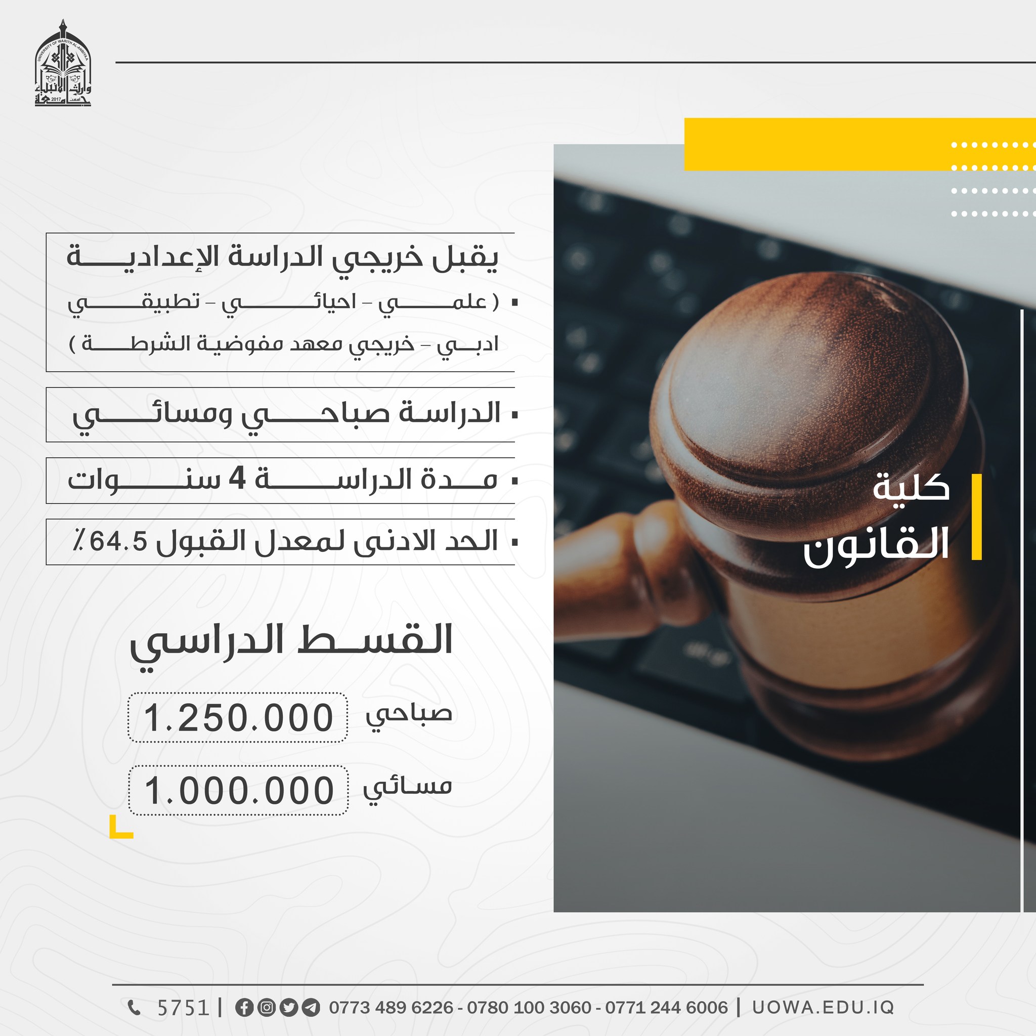 سارعوا بالتسجيل لكي لاتفوتوا فرصة الدراسة الاكاديمية في كليات واقسام جامعة وارث الانبياء(عليه السلام)