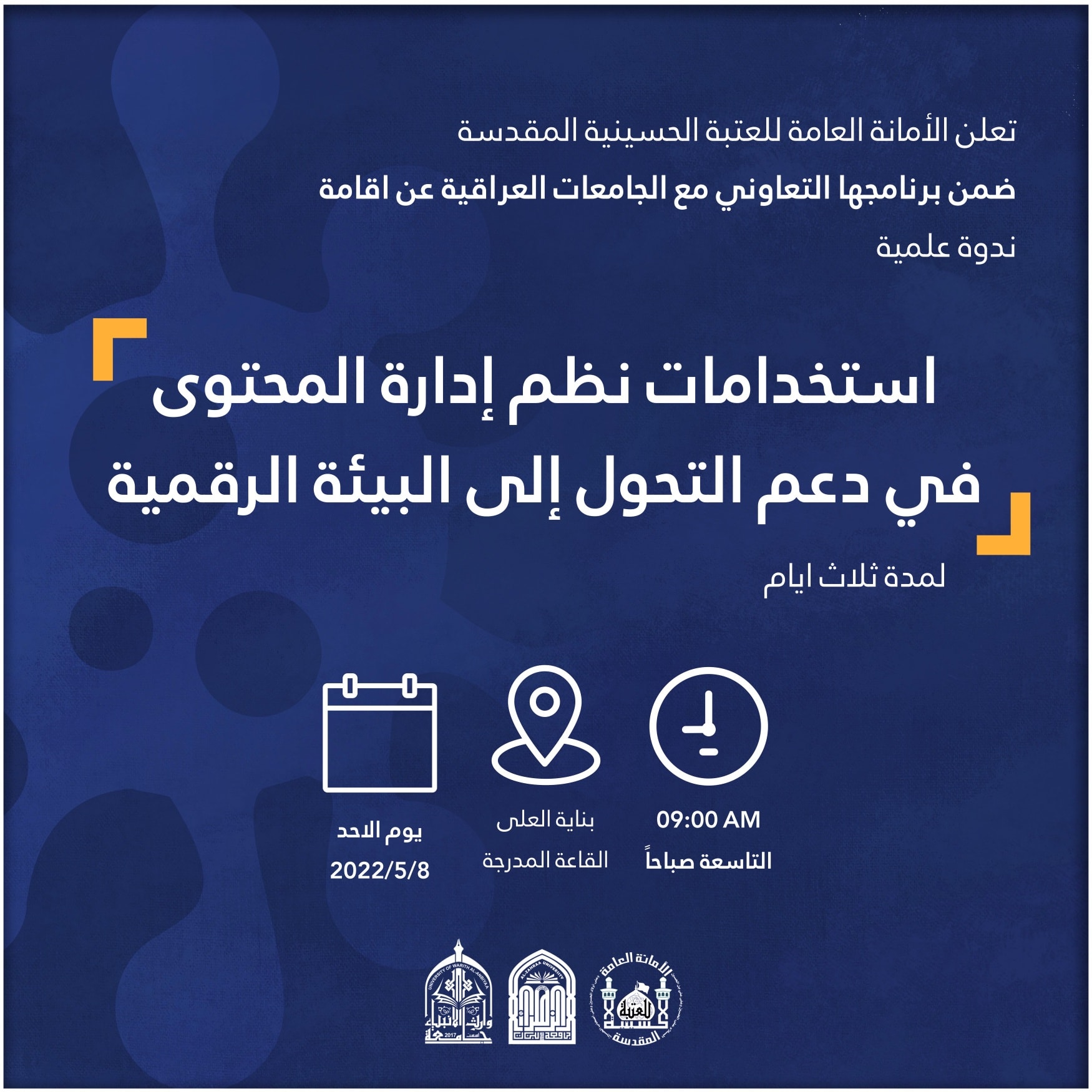 علماً أن أجور االاشتراك هي 25.000 دينار عراقي، والدورة تستمر لثلاثة أيام ابتداءً من اليوم السبت الموافق 16-4-2022.