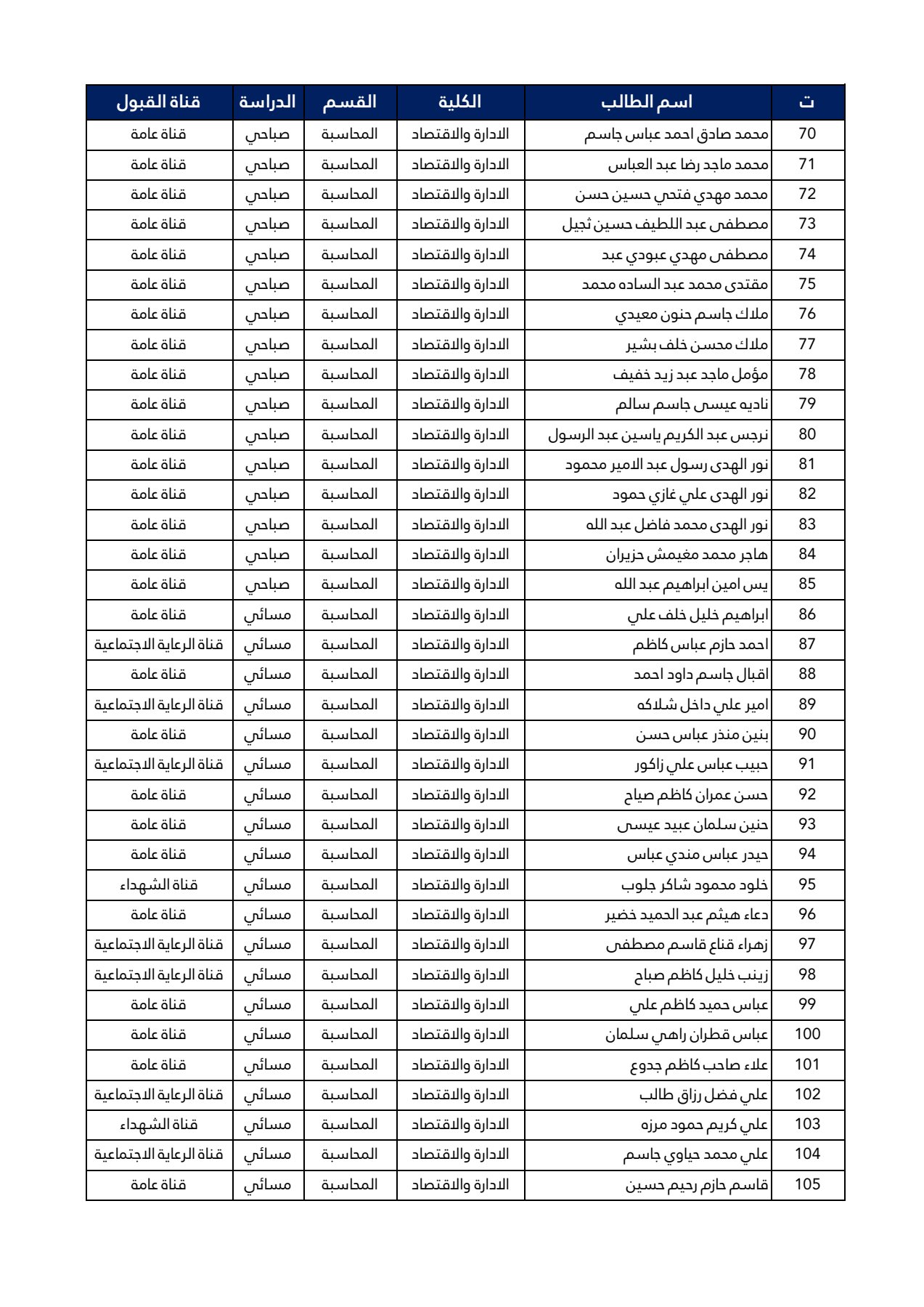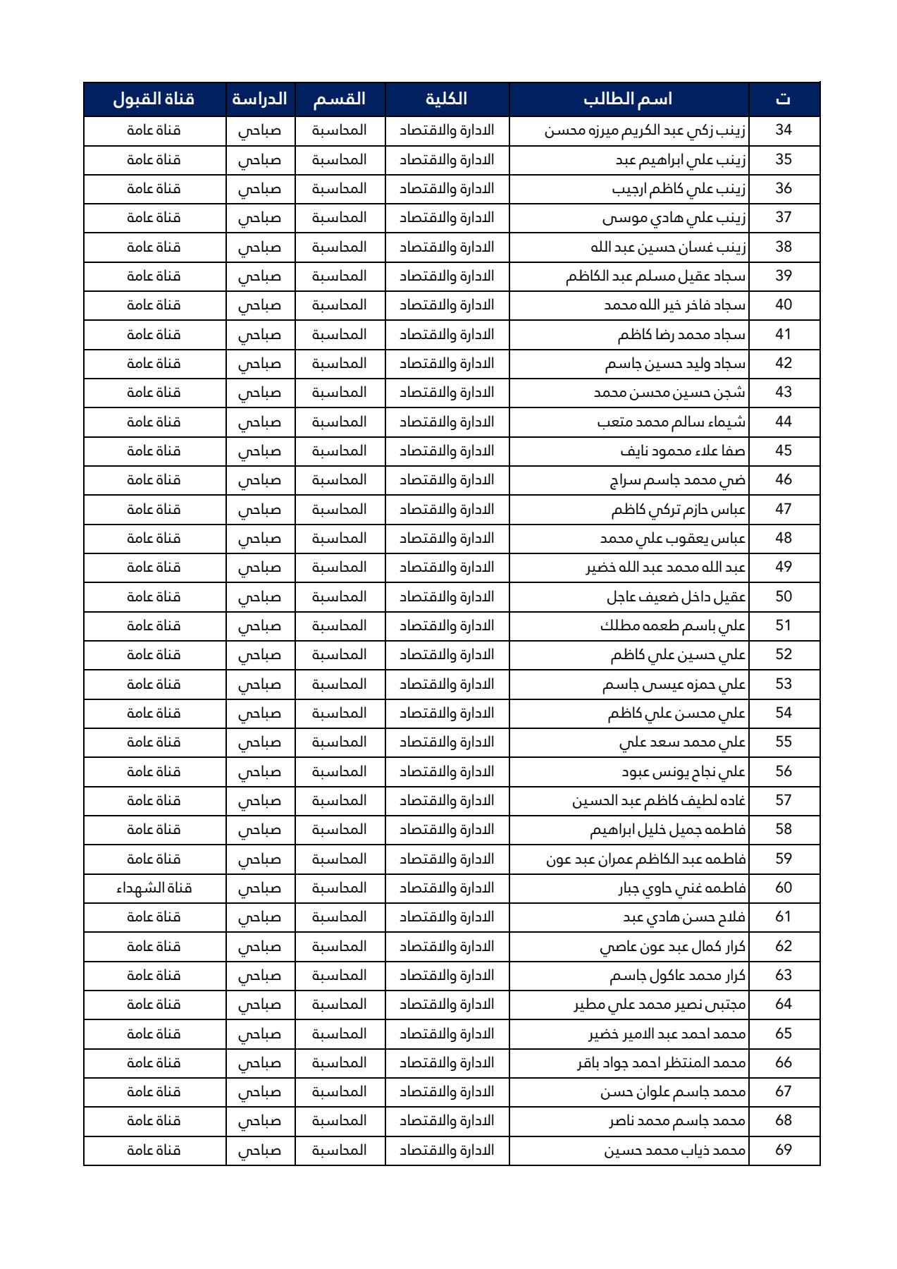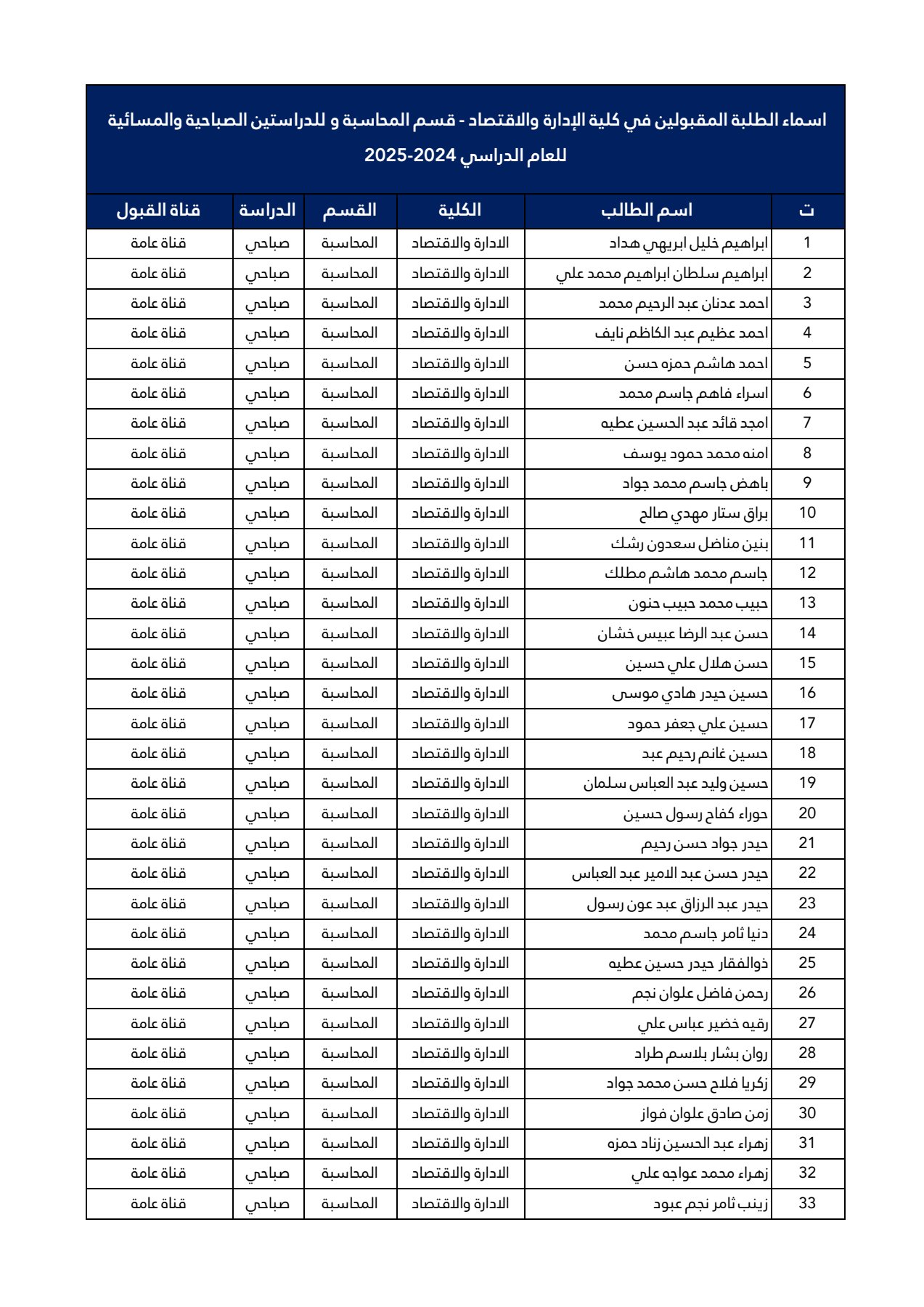 اسماء طلبة المرحلة الأولى قسم المحاسبة 2024-2025