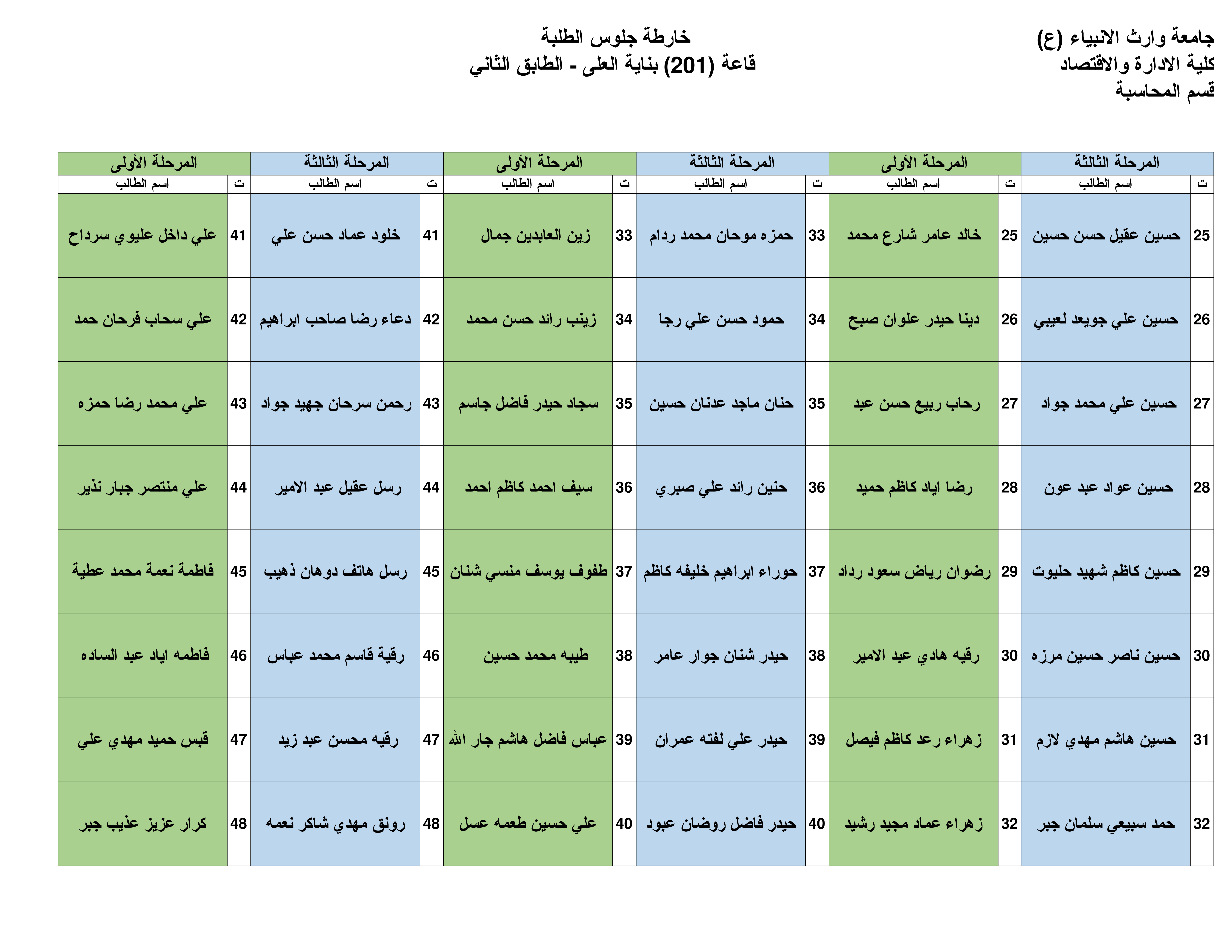 نرفق لكم خارطة الجلوس في القاعات الامتحانية لقسم المحاسبة للمرحلة الأولى والثالثة وكما موضحة في أدناه