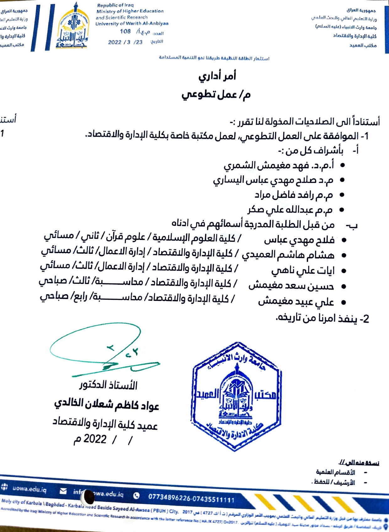 ساهم مجموعة من طلبة كلية الادارة والاقتصاد قسم المحاسبة في جامعة وارث الانبياء في مبادرة التشجير الخاصة بالانشطة الطلابية