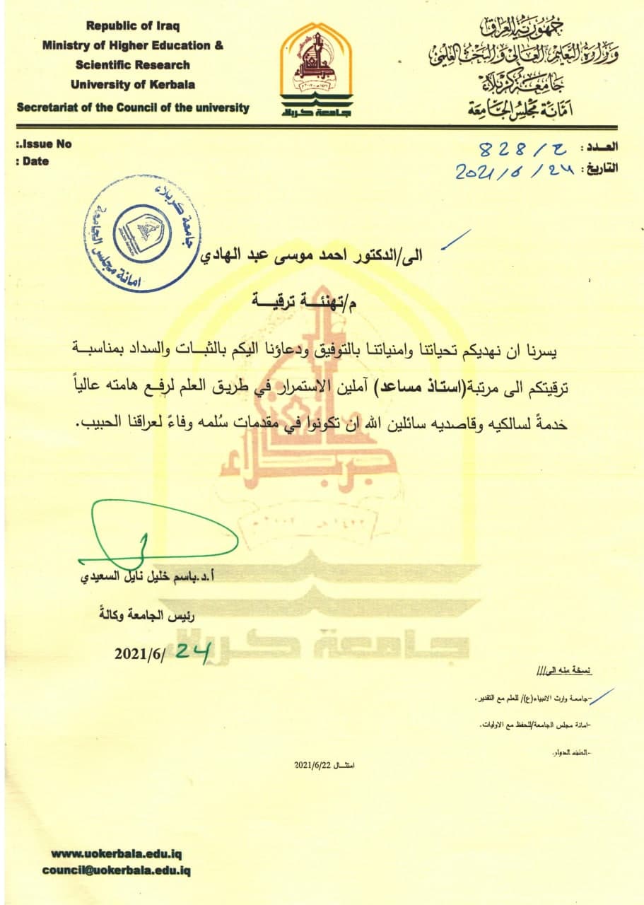 تقدمت جامعة كربلاء بالتهاني إلى الأستاذ المساعد الدكتور احمد موسى عبدالهادي بمناسبة ترقيته إلى مرتبة أستاذ مساعد متمنين له الاستمرار في طريق العلم لرفع هامته عالياً خدمة لسالكيه و قاصديه.