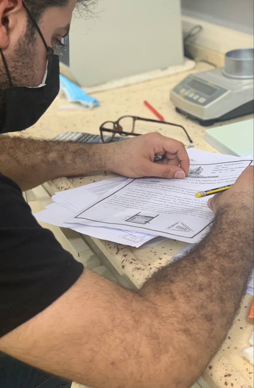 جانب من الامتحان الحضوري لطلبة المرحلة الرابعة - قسم الهندسة المدنية يوم الثلاثاء المصادف 28/7/2021 وسط اجراءات وقائية مشددة.