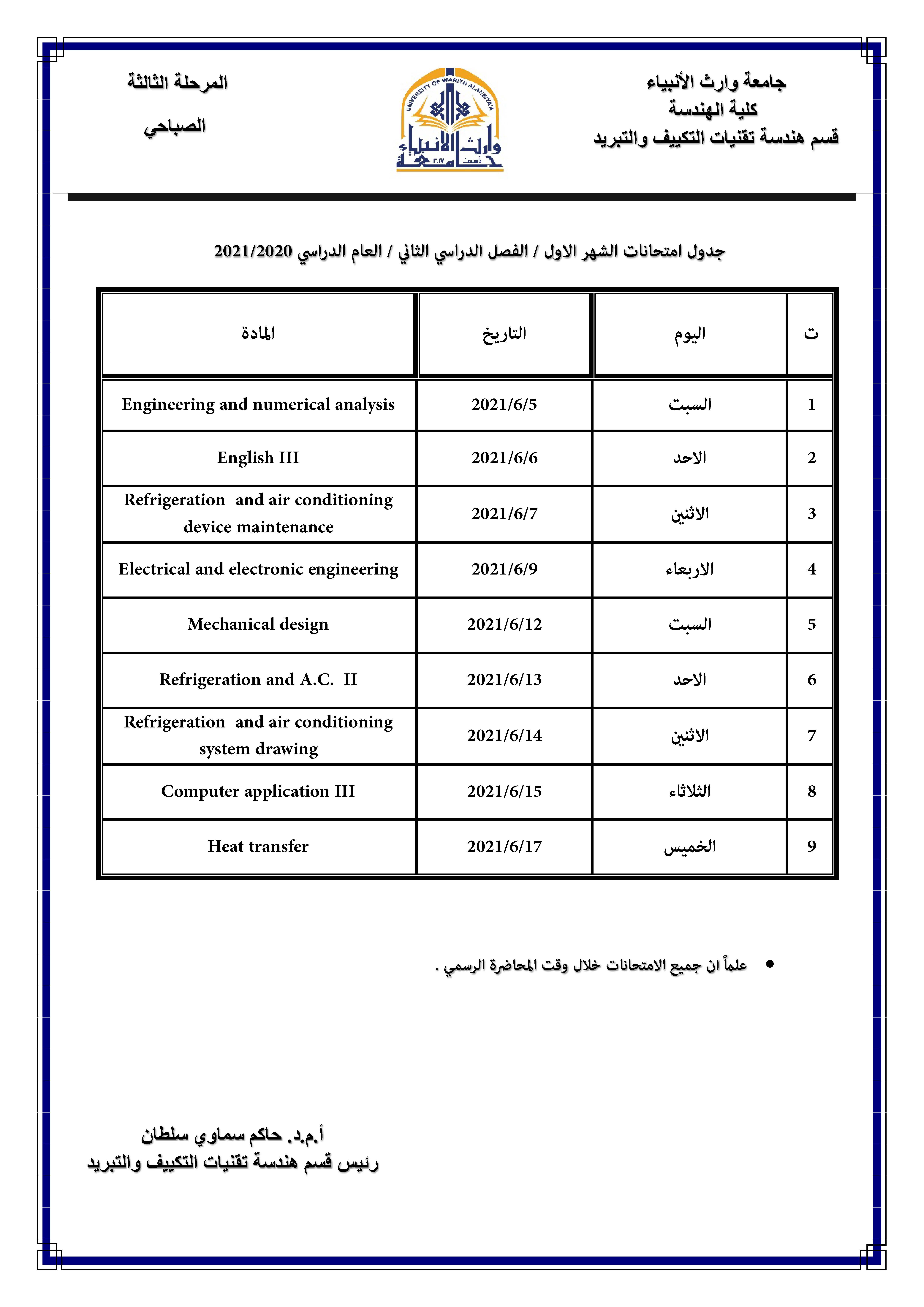 يقيم قسم هندسه الطب الحياتي بالتعاون مع قسم التعليم المستمر في جامعه وارث الأنبياء سلسلة من الحلَقات النقاشية الحضورية ابتداءاً من يوم الأحد المصادف 30/5/2021 و كما في الجدول المرفق.