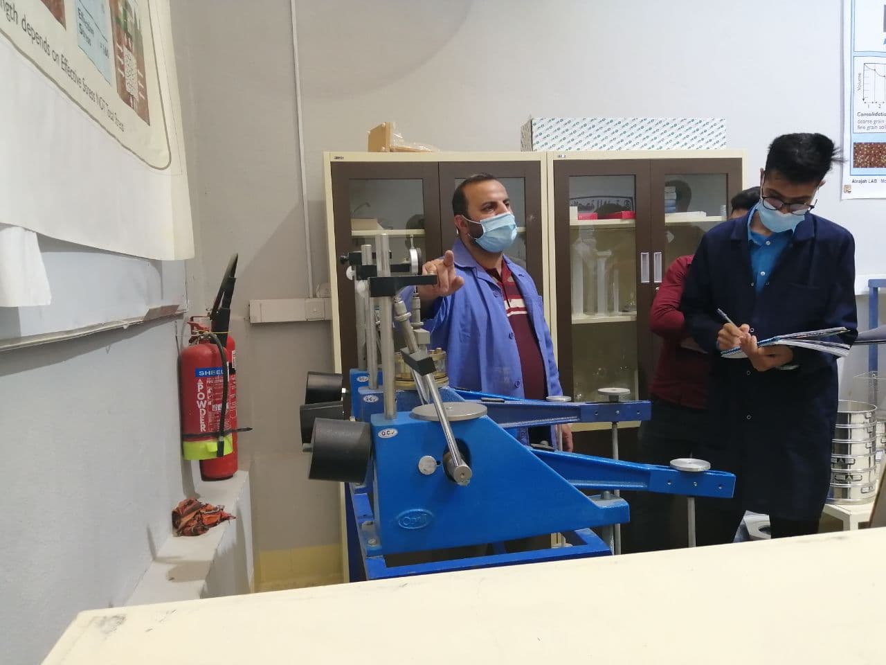 جانب من الجزء العملي من البحث العلمي للتدريسي م.م مصطفى نعيم في مختبرات قسم الهندسة المدنية و الذي يدرس فيه تحسين خصائص التربة إضافة إلى أثر هذه التحسينات على تطبيقات الهندسة المدنية.