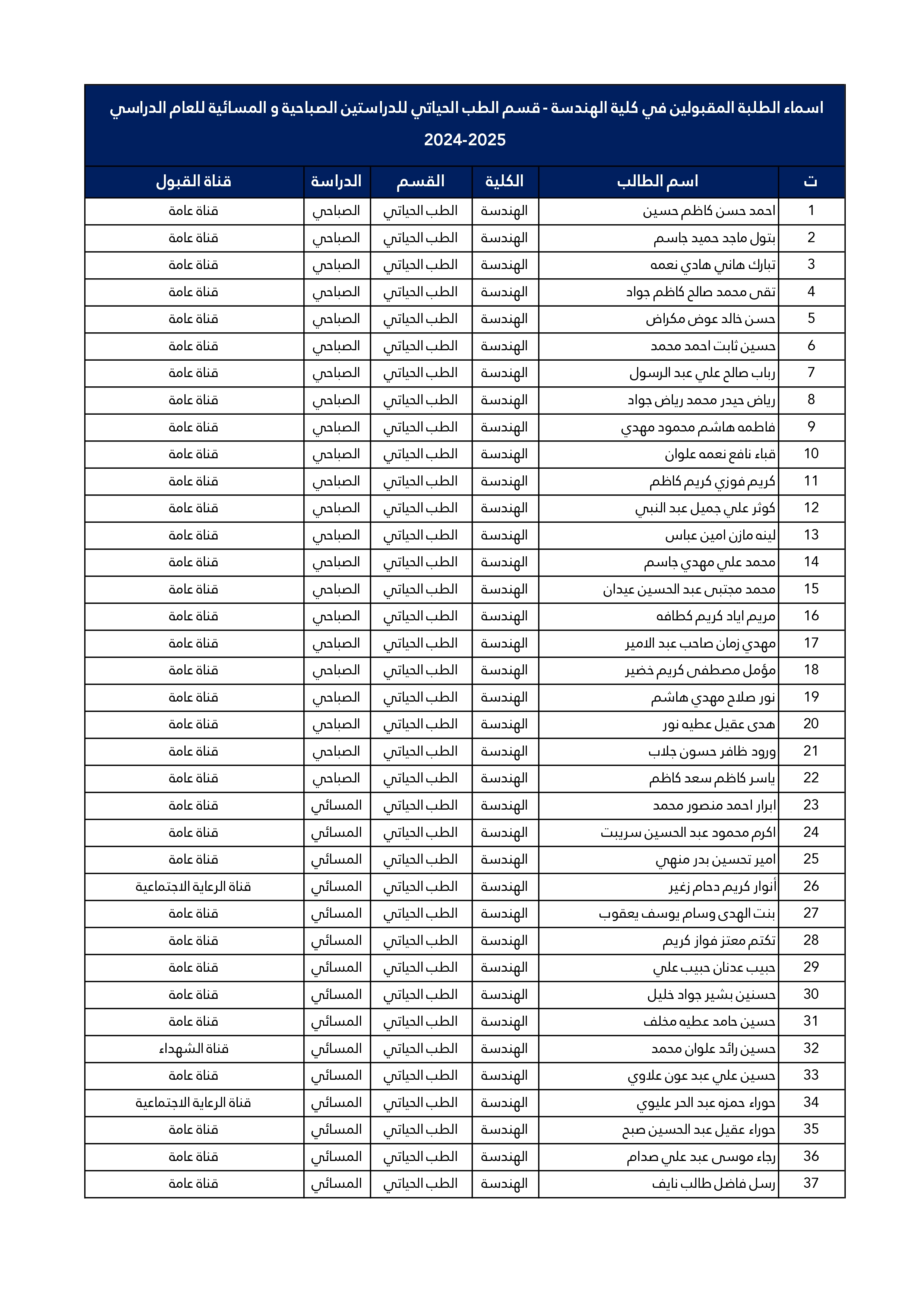 اسماء الطلبة المقبولين في قسم هندسة الطب الحياتي للعام الدراسي 2025/2024 للدراستين الصباحية و المسائية