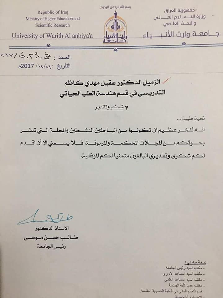 قدمت الامانة العامة للعتبة الحسينية المقدسة ورئاسة جامعة وارث الانبياء كتابِ شُكرٍ وتقديرالى الدكتور (عقيل مهدي كاظم) التدريسي في كلية الهندسة (قسم هندسة الطب الحياتي) لنشره اول بحثيين رصينين بأسم جامعة وارث الانبياء (عليه السلام) في مجلات ((Thomson Reuters( العالمية ذات معامل التأثير الرصين) وعبرتا الامانة ورئاسة الجامعة عن أمنياتهيما له بالمزيد من العطاء والتوفيق والسداد في اعماله .