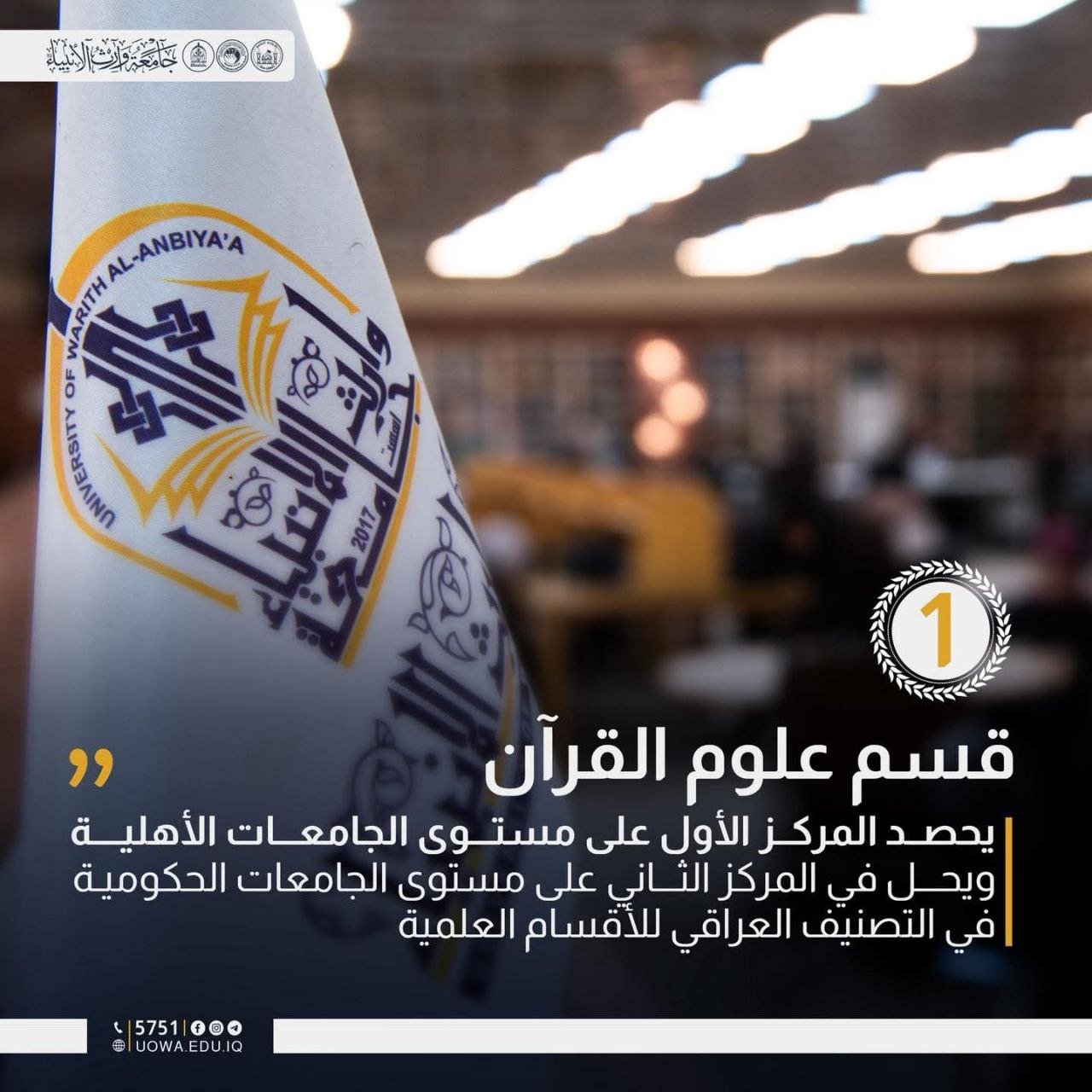 أحرز قسم علوم القران في كلية العلوم الاسلامية بجامعة وارث الأنبياء (عليه السلام) المركز الأول على الجامعات الأهلية وجاء في المرتبة الثانية حكوميا ضمن نتائج التصنيف العراقي للأقسام العلمية، ما يعكس مستوى الأداء الأكاديمي المتميز للكلية ومكانتها المتقدمة ضمن مؤسسات التعليم العالي في العراق.