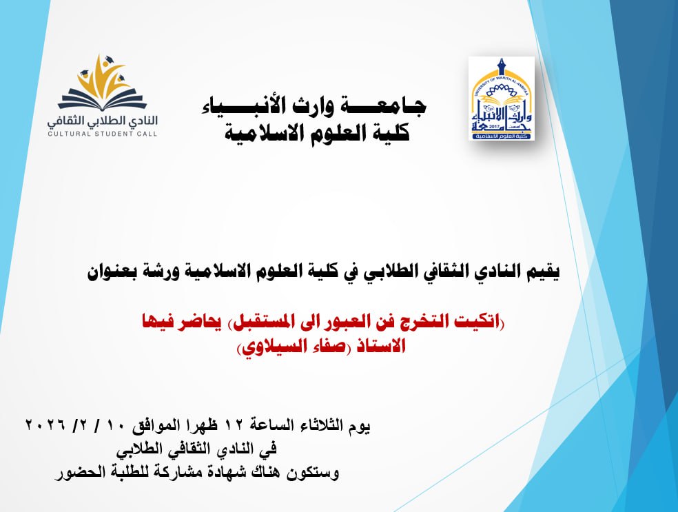 يدعو النادي الثقافي الطلبة الكرام إلى حضور الورشة الموسومة «إتيكيت التخرج: فن العبور إلى المستقبل»، والتي سيحاضر فيها الأستاذ صفاء السيلاوي، وذلك يوم الثلاثاء الموافق 10 / 2 / 2026 في تمام الساعة الثانية عشرة ظهرًا.