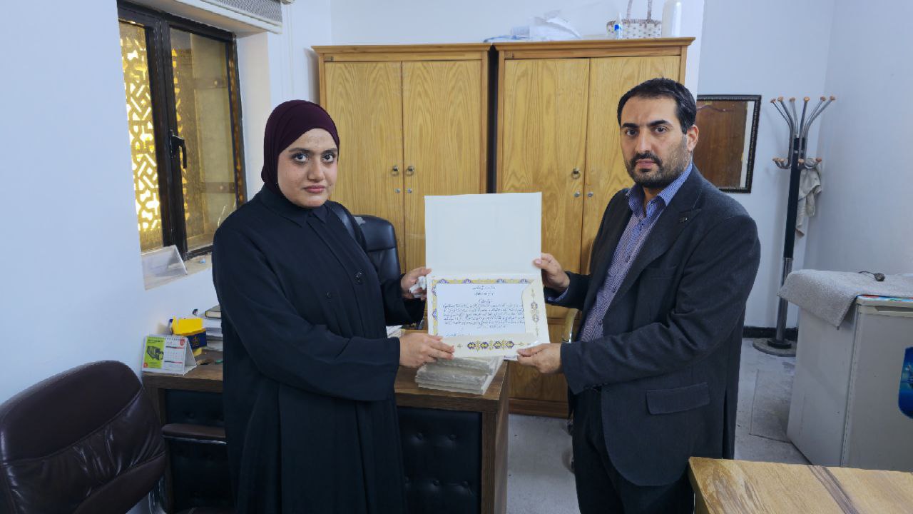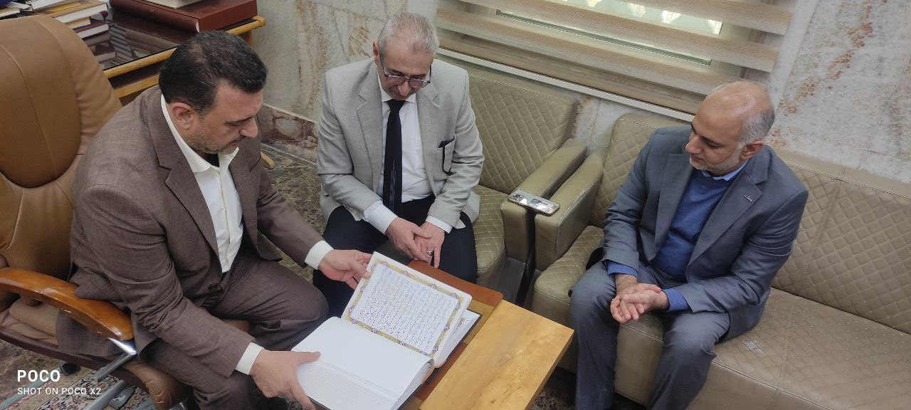 تسلّم وفد من كلية العلوم الإسلامية برئاسة السيد عميد الكلية الدكتور طلال فائق الكمالي المصحفَ الشريف المخطوط بأقلام طلبة وأساتذة ومنسوبي جامعة وارث الأنبياء (عليه السلام)، وذلك بعد إتمام أعمال تجليده في مركز مخطوطات العتبة الحسينية المقدسة، متمثلاً بـ السيد الدكتور مناف التميمي مدير المركز.