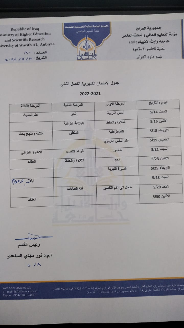 اعلن قسم الفقه وأصوله في كلية العلوم الإسلامية في جامعة وارث الانبياء وضمن استعداده لإجراء الامتحانات الشهرية للفصل الدراسي الثاني للعام الدراسي الثاني 2022 جدول الامتحانات الشهرية