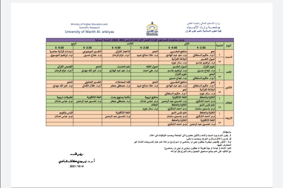جدول الدروس الاسبوعي لقسم علوم القرآن / الدراسة المسائية