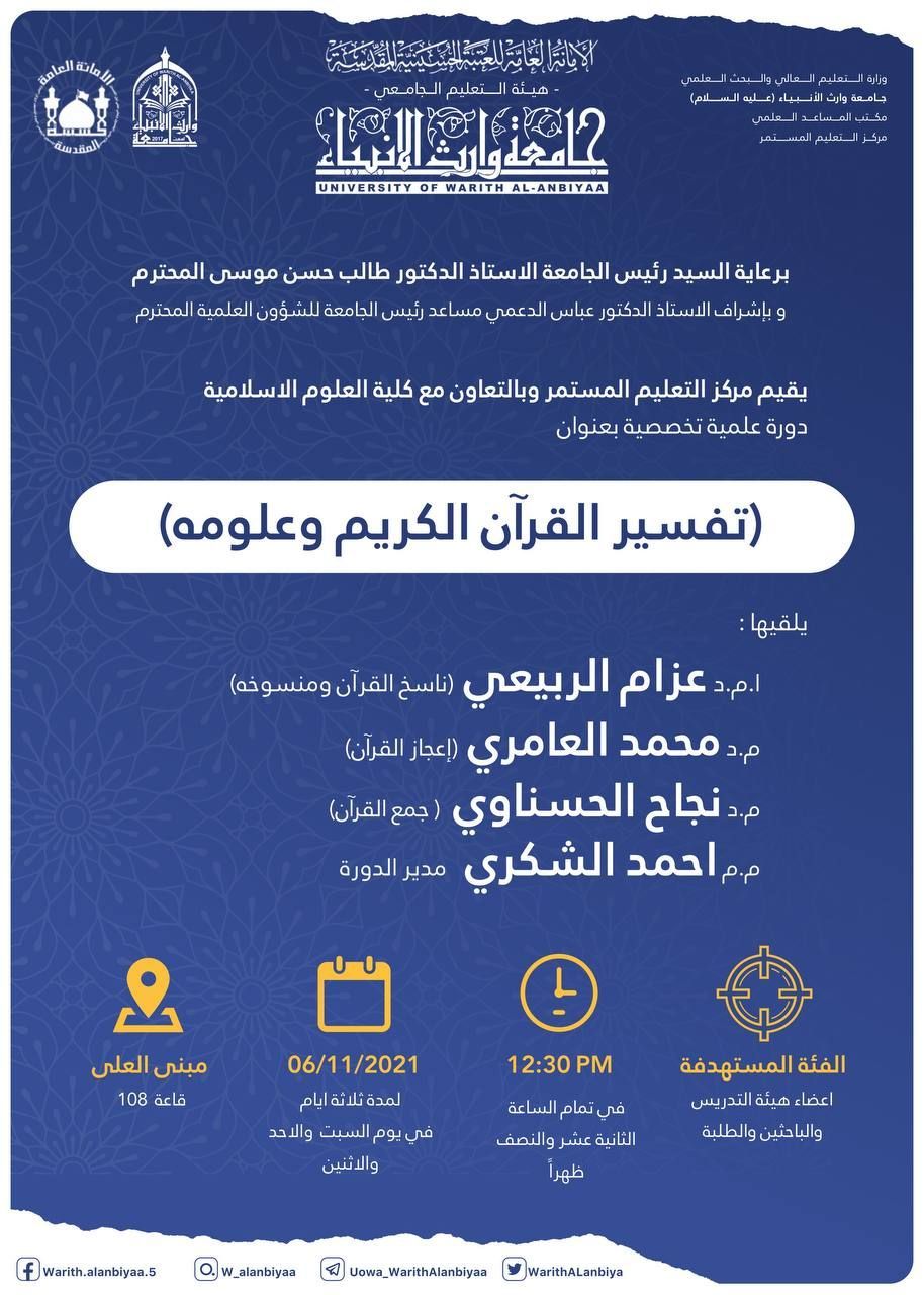 تقيم جامعة وارث الأنبياء (عليه السلام) *كلية العلوم الإسلامية*ومستشارية الأمانة العامة للشؤون القرآنيةبالتعاون مع *جامعة أهل البيت (عليهم السلام) العالمية*