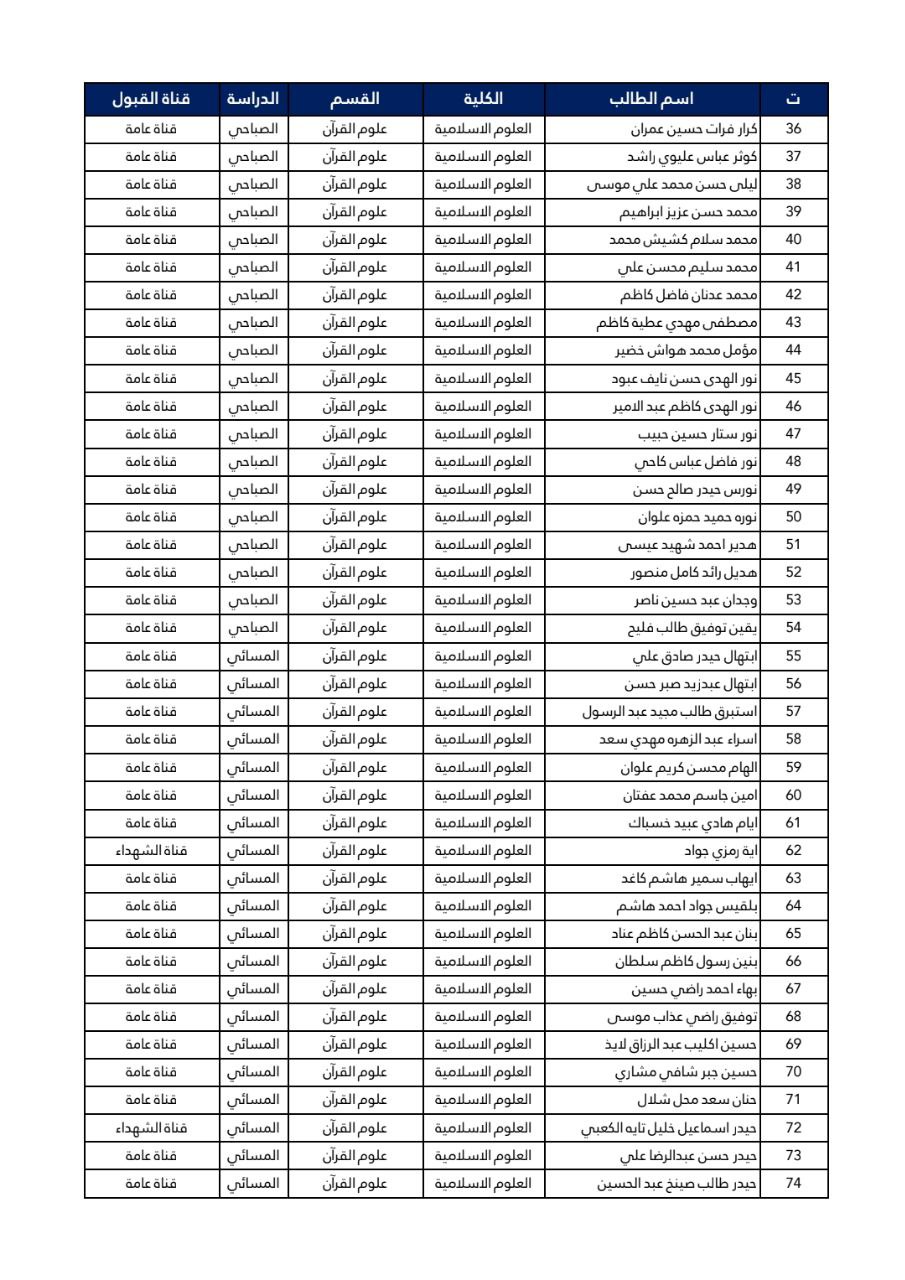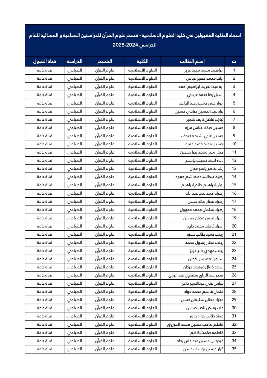 اسماء الطلبة المقبولين في كلية العلوم الاسلامية قسم علوم القرآن للعام 2024-2025