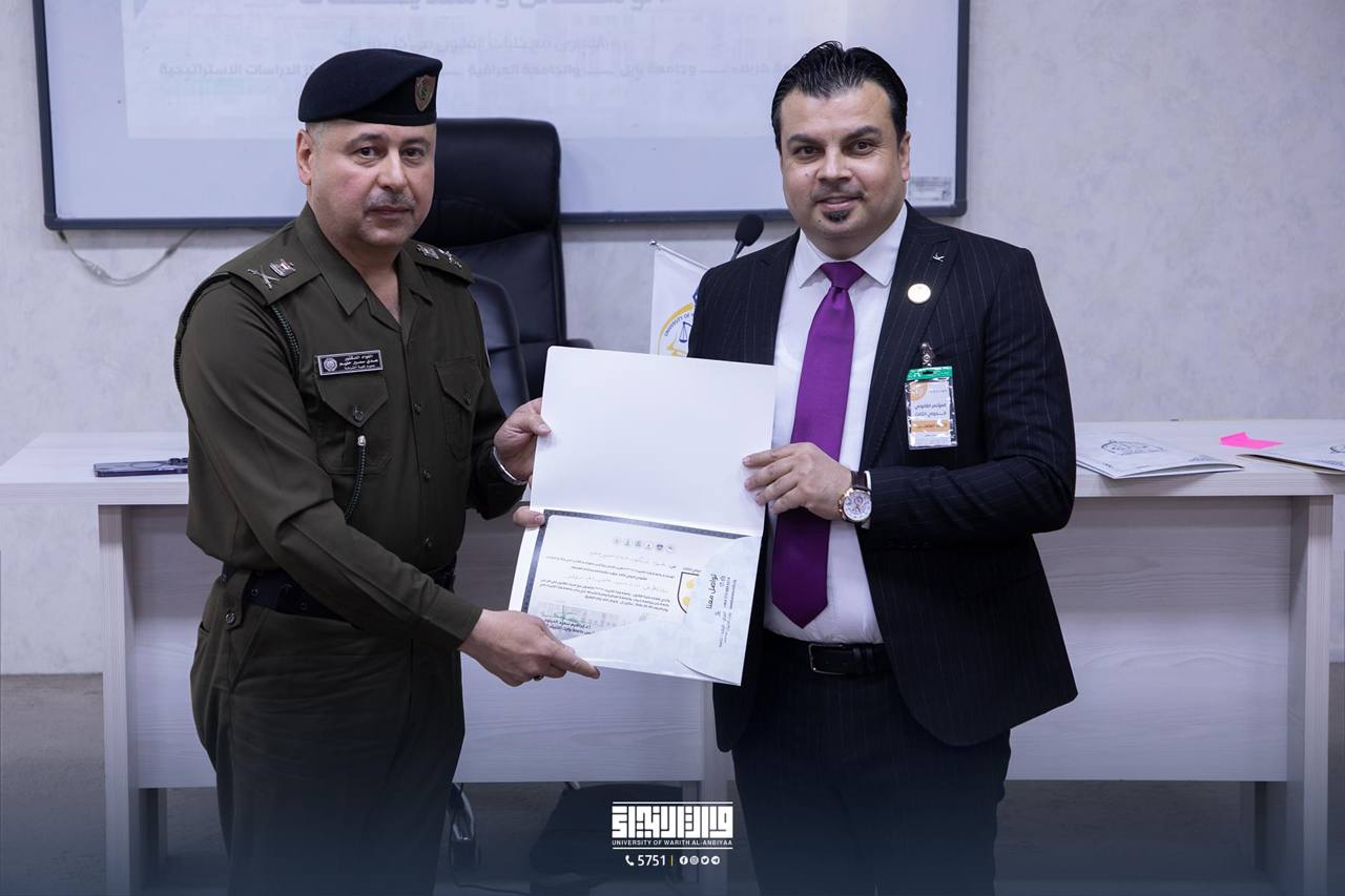 اختتام   الجلسات البحثية " للمؤتمر العلمي الدولي الثالث" الذي اقامته كلية القانون في جامعة وارث الانبياء(عليه السلام)،  إذ شهدت هذه الجلسات حوارات هادفة وإثراءات غنية انتفع منها الباحثين والحضور على حد سواء حيث كرم السيد عميد كلية القانون أ.م.د. علي صاحب الشريفي مدير كلية الشرطة اللواء أ.د. عدي سمير الحساني