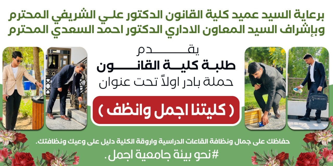 نفذ طلبة  كلية القانون  باشراف السيد عميد كلية القانون ا.م.د. علي صاحب الشريفي و السيد المعاون الاداري م.د. احمد صبري كاظم نشاط طلابي بعنوان بادر اولا نحو بيئة جامعية اجمل  يهدف إلى تحسين البيئة الجامعية وجعلها أنظف، فهذا يعد خطوة رائعة نحو تعزيز الوعي البيئي بين الطلاب والمساهمة في تحسين الحرم الجامعي.