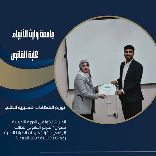 قامت كلية القانون في جامعة وارث الأنبياء (عليه السلام) فعالية لتوزيع الشهادات التقديرية للطلبة الذين أتموا بنجاح مشاركتهم في الدورة التدريبية الموسومة "المركز القانوني للطالب الجامعي وفق تعليمات انضباط الطلبة رقم (160) لسنة 2007 المعدلة".
