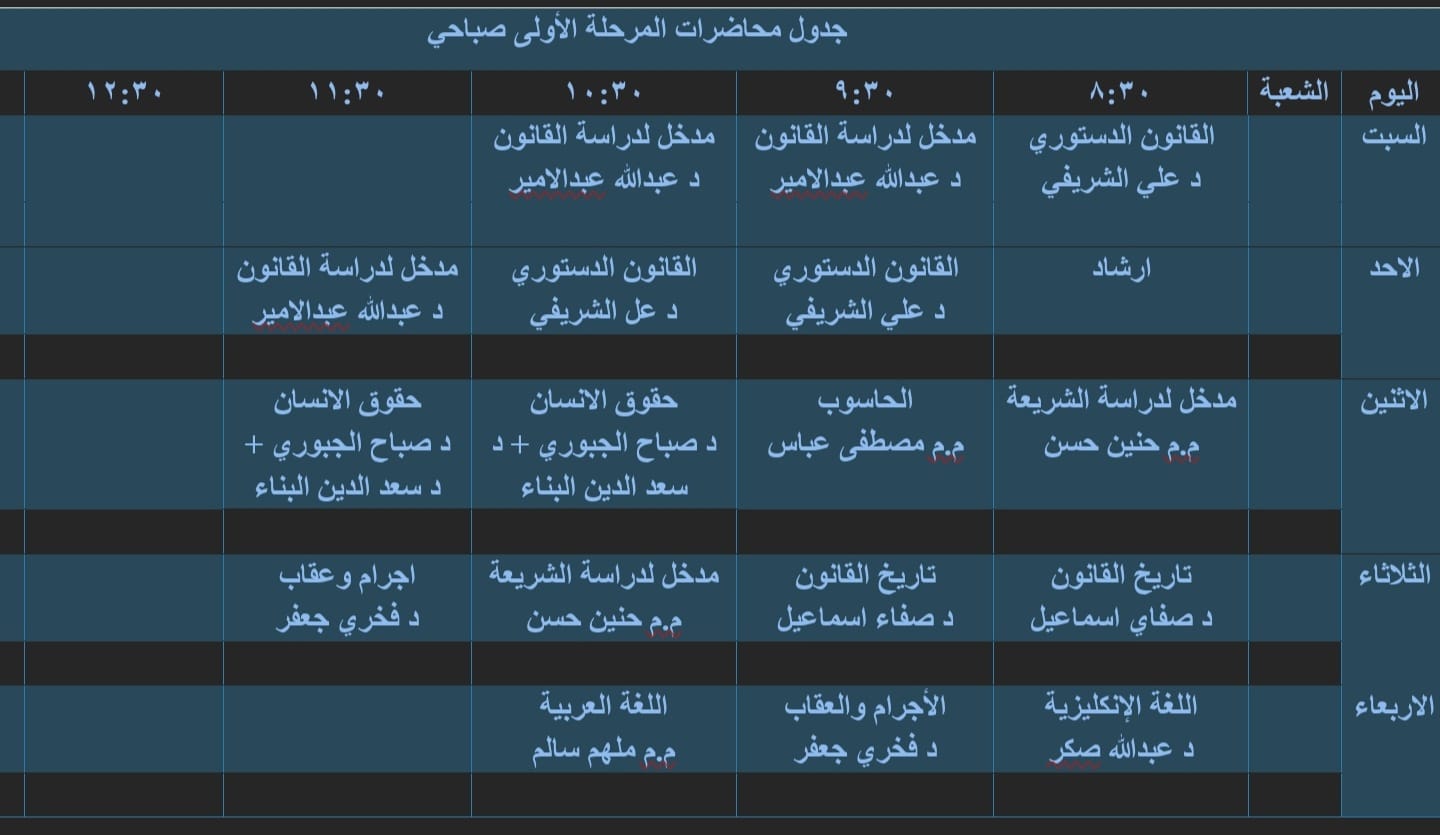 ترحب كلية القانون بالطلاب الجدد وتتمنى لهم عاماً دراسياً مميزاً ومليئاً بالنجاح والتفوق وتود اعلامها بان موعد بدأ الدوام الرسمي يوم السبت الموافق 7/12/2024 وكما موضح في الجدول الاسبوعي