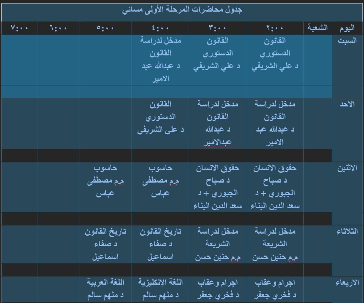 الجدول الاسبوعي للمرحلة الاولى الدراسة المسائية