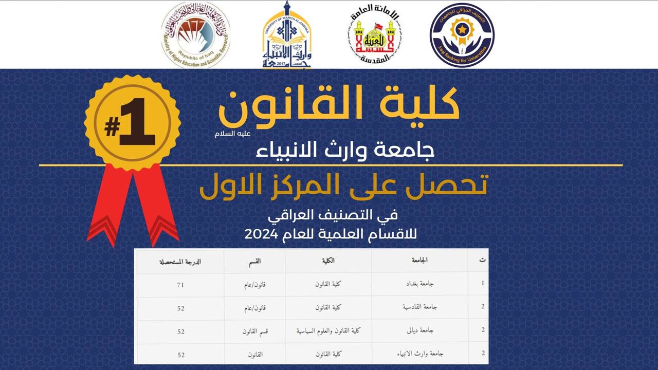 حققت كلية القانون في جامعة وارث الانبياء(عليه السلام) إنجازًا علمياً متميزاً بحصولها على المركز الأول على الجامعات الاهليه والمركز الثاني مكرر على الجامعات العراقيه في التصنيف العراقي للأقسام العلمية، الذي أصدرته وزارة التعليم العالي والبحث العلمي.ويأتي هذا الإنجاز نتيجة الجهود الكبيرة التي بذلتها عمادة الكلية و كوادرها التدريسية والإدارية في تحقيق معايير الجودة الأكاديمي