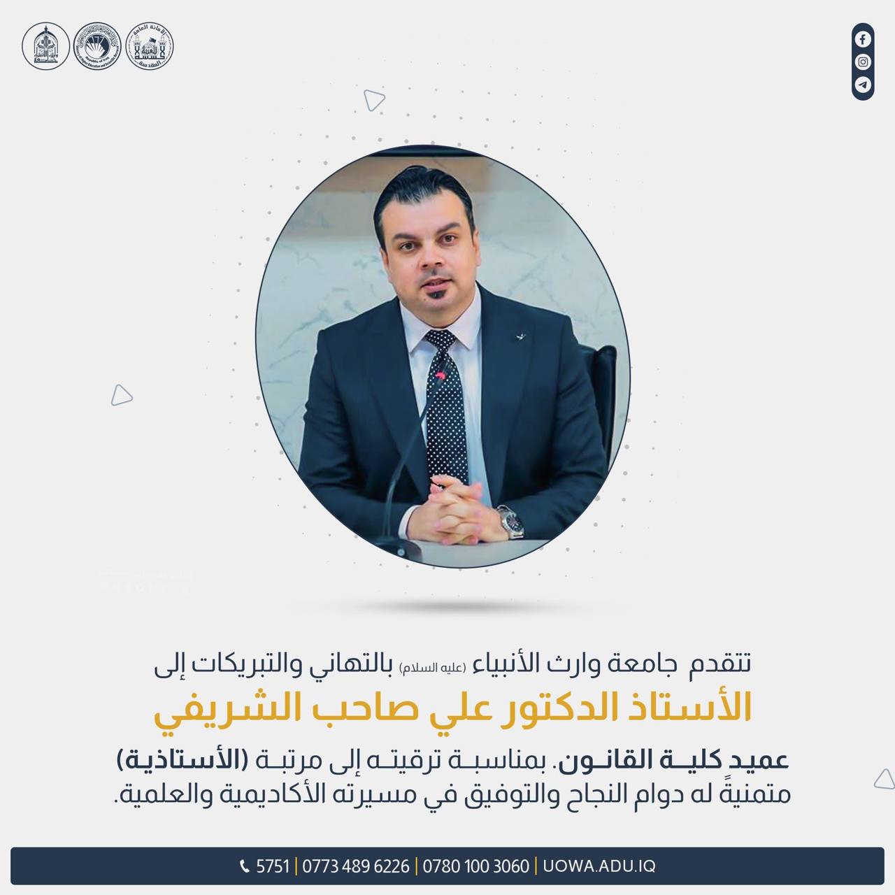 نهنئ عمادة كلية القانون  أ.د. على صاحب الشريفي لحصوله على لقب "أستاذ دكتور"، وهو إنجاز علمي كبير يعكس تفوقه وإسهاماته المستمرة في مجال التعليم والبحث العلمي، إن هذا التكريم هو نتيجة سنوات من الجهد والتميز في مجال الأكاديمي، ونتمنى له المزيد من التقدم والنجاح في مسيرته العلمية والعملية.