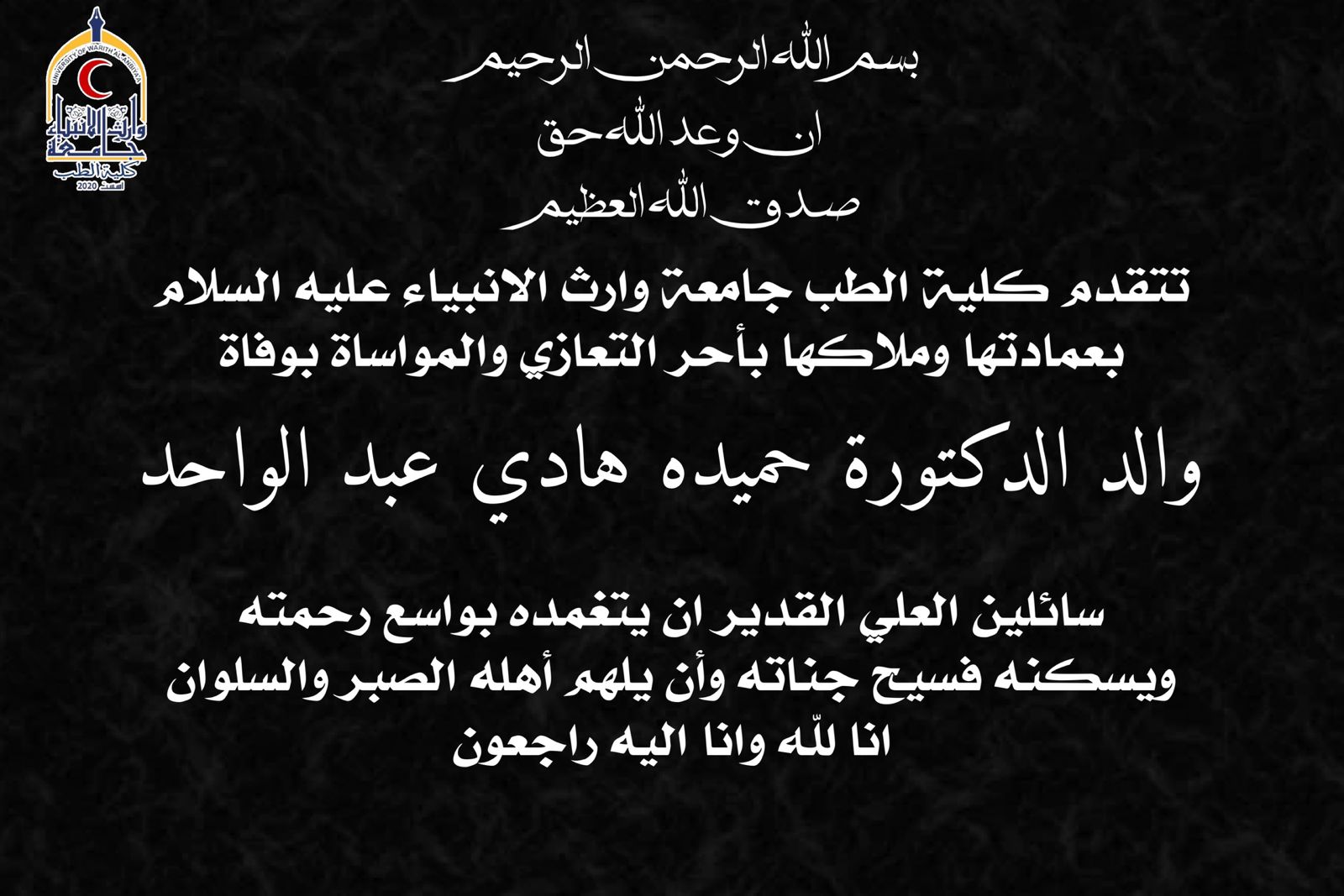 بسم الله الرحمن الرحيمإِنَّا لِلَّهِ وَإِنَّا إِلَيْهِ رَاجِعونَ“يبالغ الحزن والأسى تلقينا نبأ وفاة (عمة الاستاذ الدكتور سالم البصام )، وبهذا المصاب الجلل نتقدم اليه بخالص التعازيوصادق المواساةنسأل الله العلي القدير أن يغفر لها ويرحمها، وأن يسكنها فسيح جناته، وأن يلهم ذويها الصبر والسلوانعظم الله أجركم، وأحسن عزاءكم، وغفر لميتكمعمادة كلية الطب جامعة وارث الانبياء