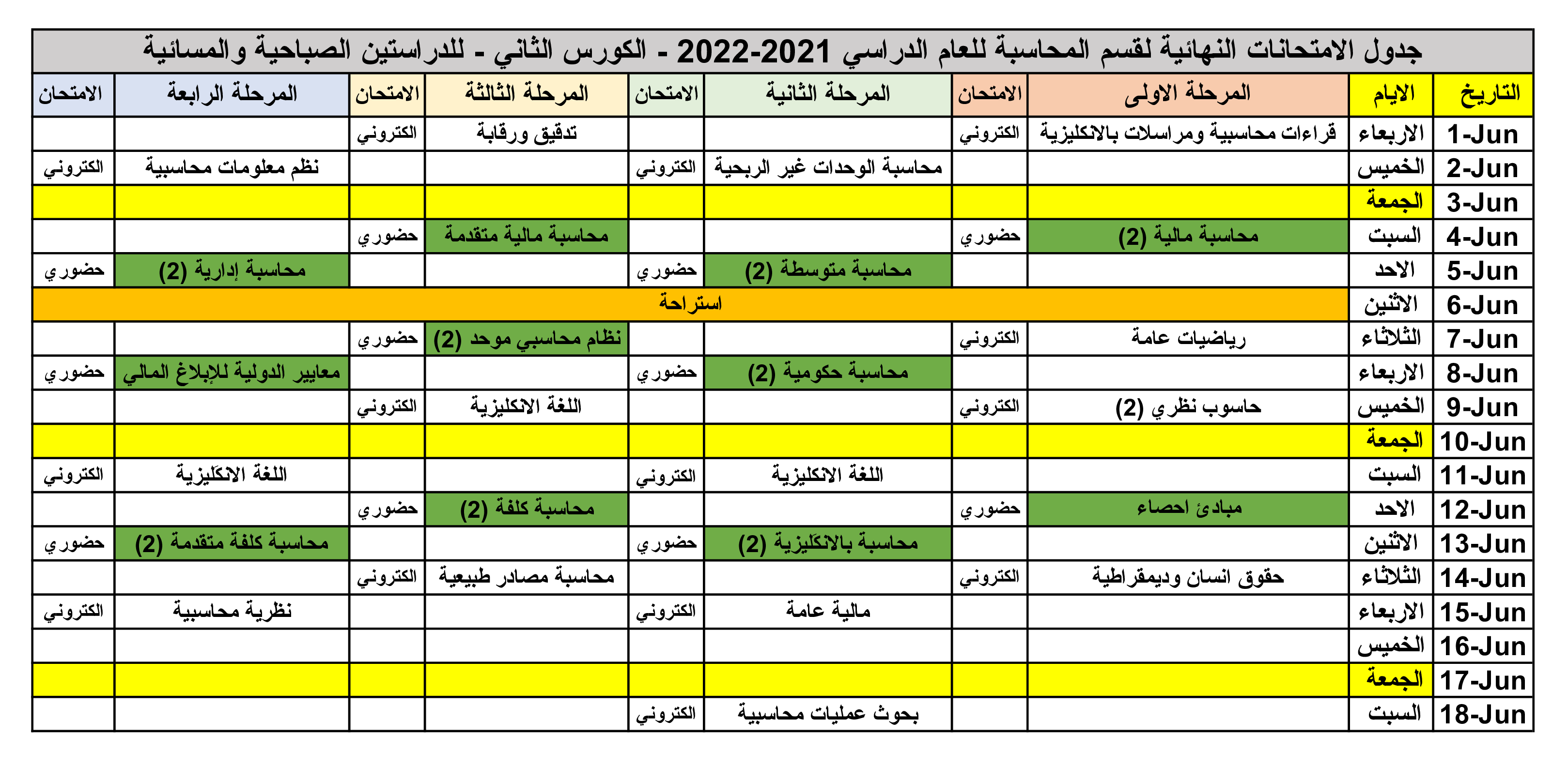 جدول الامتحانات النهائية لقسم المحاسبة للعام الدراسي 2021-2022 الفصل الدراسي الثاني و للدراستين الصباحية والمسائية