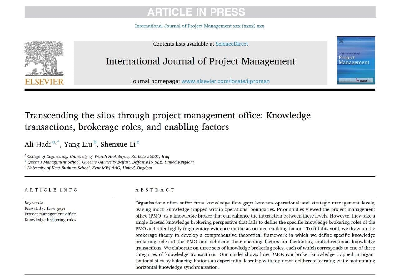 نشر الباحث والأكاديمي المدرس المساعد علي عبد الزهرة هادي رئيس قسم ضمان الجودة بحثاً علمياً في المجلة التخصصية الاولى بادارة المشاريع بالتعاون مع باحثين من جامعة كنت وجامعة كوين بلفاست في بريطانيا في المجلة العالمية International Journal of Project Management والمصنفة Q1 ذات معامل التأثير\ Cite Score 16.4 7.172 Impact Factorوقال المدرس المساعد علي عبد الزهرة: "يركز البحث على الدور المركزي لمكاتب إدارة المشاريع في تسهيل انتقال الخبرات والممارسات الفعالة بين المشاريع وادارة مكاتب المشاريع والإدارة العليا للمؤسسات بما يضمن التحسين المستمر للأداء المؤسسي، حيث أن أهمية البحث تكمن في التأكيد على ضرورة استحداث مكاتب إدارة مشاريع مركزية تتولى مسؤولية التنسيق العالي بين التنفيذ واكتساب الخبرات من جهة والتعلم من هذه الخبرات لتحقيق التحسين المستمر من جهة أخرى".