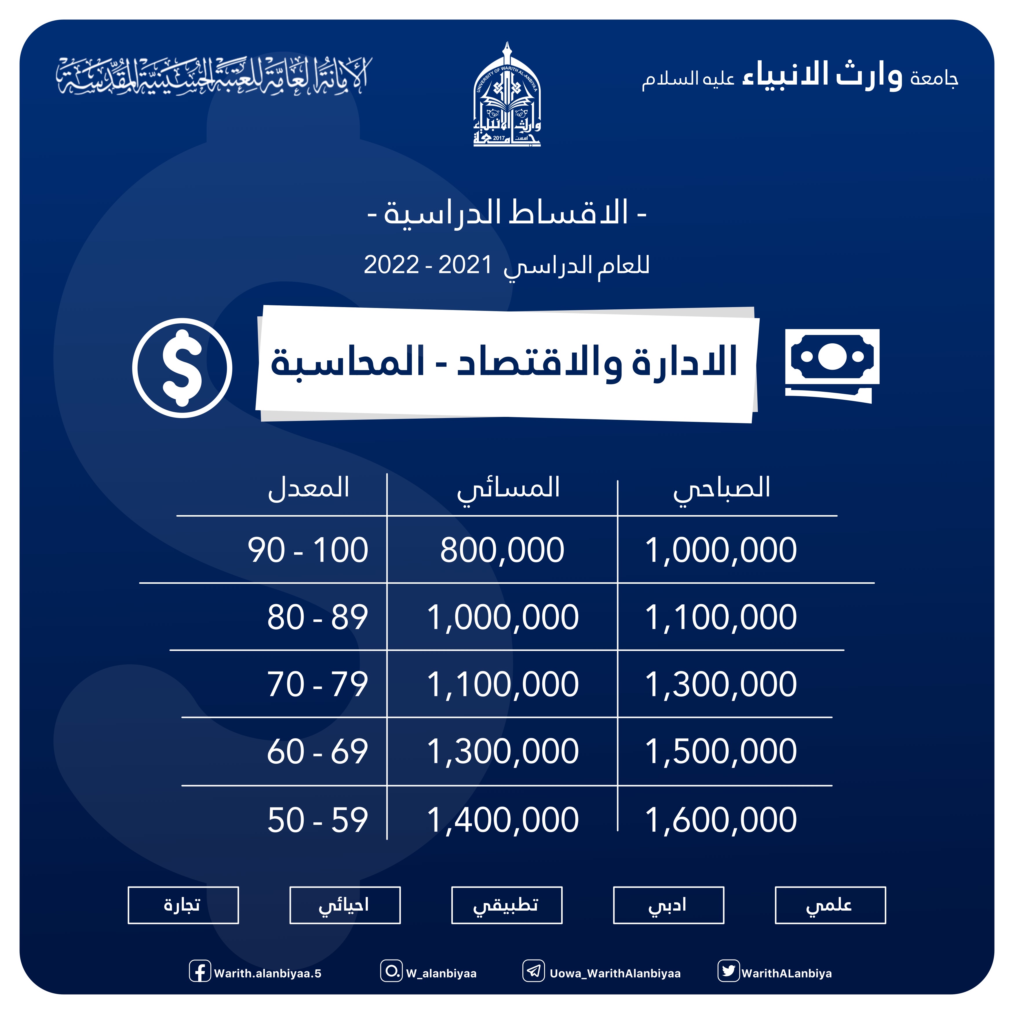أطلقت جامعة وراث الأنبياء (عليه السلام) سلم الأجور الدراسية ومعدلات القبول لكلا الدراستين الصباحية والمسائية للعام الحالي 2021-2022 بحسب ضوابط وزارة التعليم العالي والبحث العلمي.