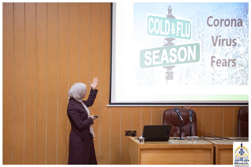 التي تحدثت لنا قائلة :تناولت المحاضرة فيروس كورونا المنتشر في الصين وعدد من دول العالم في الآونة الأخيرة والمسمى بـمتلازمة الشرق الأوسط حيث ان سبب تسميته هذه تعود إلى اكتشاف الفيروس لأول مرة في الممكلة العربية السعودية عام 2012 وهو سلالة جديدة من الفيروسات لم يسبق التعرّف إليها من قبل ، وتتراوح حدّته بين البرد العادي وبين النزلة الرئوية .وأضافت :بسبب أنّ أغلب إعراضه تنفسية أطلق عليه أيضاً بمتلازمة الشرق الأوسط التنفسية .تطرقت المحاضرة الى إعراض المرض وأسبابه ، اما علاجه فإلى الان لم يتم التوصل الى العلاج الملائم للفايروس لكن يمكن ان يتجنبه الشخص من خلال معرفته بكيفية الوقاية من هذا الفايروس بإتباع الارشدادات الوقائية مثل الاهتمام بغسل اليدين جيداً ولبس الكمامات في الأماكن العامة وتجنب الاتصال المباشر مع من تظهر عليهم اعراض امراض الجهاز التنفسي وغيرها من الاجراءات المهمة الواجب إتباعها.