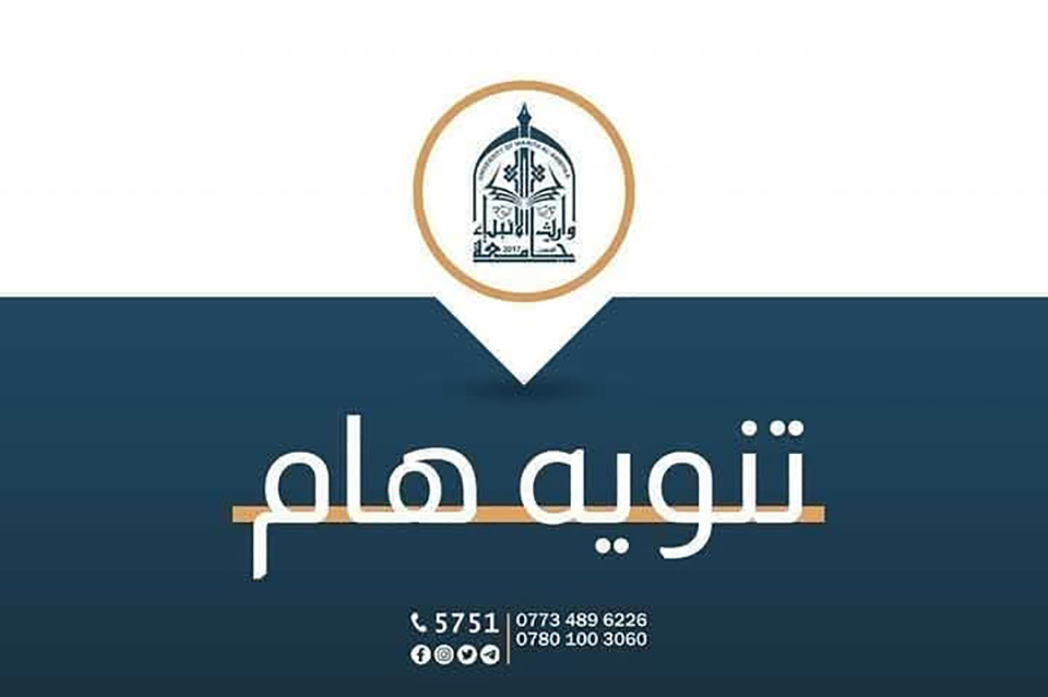 أعلن قسم التسجيل في جامعة وارث الأنبياء (عليه السلام) عن دعوة جميع الطلبة لمراجعة أقسام الكليات كلٌ حسب تخصصه، لاستلام الحسابات وكلمات المرور الخاصة بهم. كما أكدت الجامعة على أهمية متابعة تطبيق الجامعة والالتزام بالتعليمات المتعلقة بالصور والمعلومات الأخرى المطلوبة.
