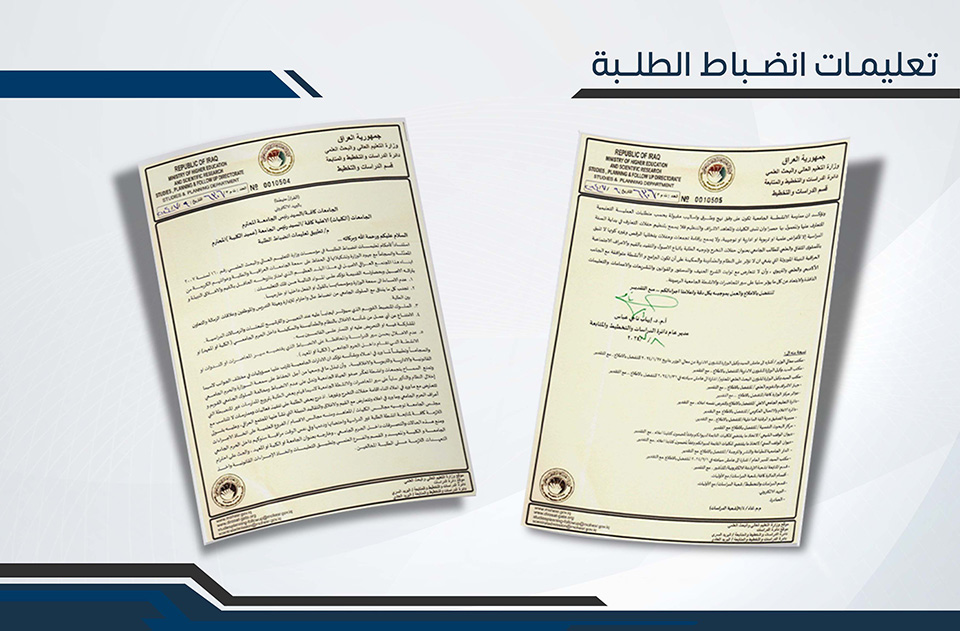 تحرص جامعتنا على تتويج مسيرتكم العلمية بقيم الانضباط والالتزام، التي تعدّ حجر الأساس لتسهيل الإجراءات الإدارية ، إلى جانب تعزيز بيئة تعليمية مثالية. وفي هذا السياق، ندعوكم إلى الالتزام بمجموعة من التعليمات التي تهدف إلى دعم مسيرتكم الأكاديمية وتحقيق تطلعاتكم.
