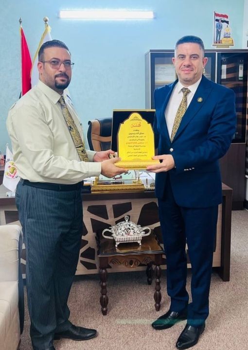 الاستاذ الدكتور مرتضى غانم الجبوري عميد كلية التمريض في جامعة وارث الانبياء مشرفًا على طالب ماجستير امير عقيل برسالته الموسومه العلاقه بين اساليب القياديه و اداء الكادر التمريضي في مستشفيات مدينة النجف الأشرف