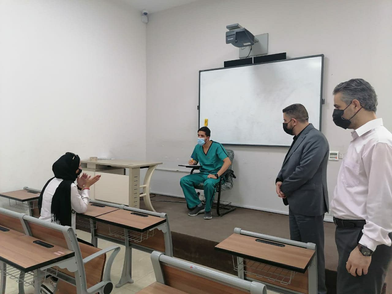 تابع السيد عميد كلية التمريض الاستاذ المساعد الدكتور مرتضى غانم الجبوري سير الامتحانات النهائية العملية الحضورية لطلبة كلية التمريض