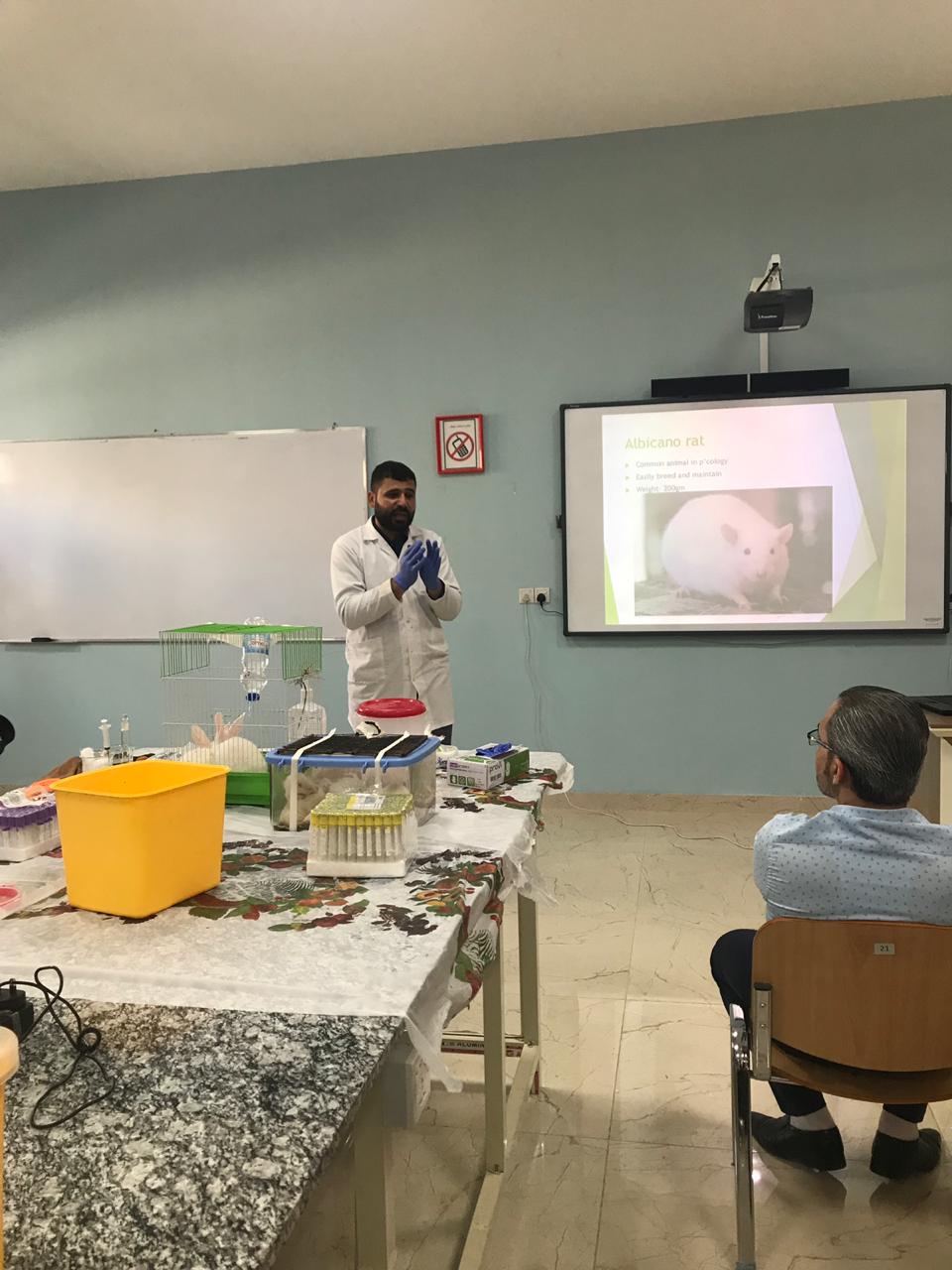 وتخللت الورشة كيفية التعامل مع الحيوانات المختبرية من حيث التغذية والحقن تحت الجلد والتجربة على الحيوانات وحساب الجرعه النصف قاتله LD 50 وطرق امساك الحيوانات وهذه الورشة تستهدف الطلاب لتعليمهم التجربة والاختبار على الحيوانات المختبرية وطلاب البحوث وطلبة الدراسات العليا.