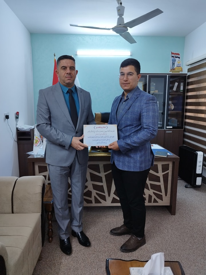 قدم السيد عميد كلية التمريض المحترم الأستاذ الدكتور مرتضى غانم الجبوري شهادة شكر وتقدير إلى الطالب امين رائد عباس لحصوله على المركز الأول في المسابقة القرآنية المقامة في جامعة الإمام الكاظم عليه السلام