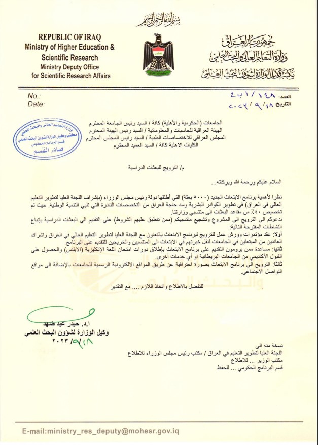 مجلس الوزاء العراقي يطلق برنامج الابتعاث لسد حاجة البلد من التخصصات النادرة، حسب كتاب وكيل وزير التعليم لشؤون البحث العلمي الاستاذ الدكتور حيدر عبد ضهد، اطلق مجلس الوزراء العراقي بإشراف اللجنة العليا لتطوير التعليم العالي في العراق برنامجه الجديد للإبتعاث، حيث خصص هذا البرنامج (5000 بعثة) دراسية لسد حاجة العراق من التخصصات النادرة ولتطوير الملاكات البشرية في مؤسسات الدولة حيث ان حصة وزارة التعليم العالي من هذه المبادرة هي 40% و ندعو من تنطبق عليهم الشروط التقديم الى البعثات الدراسية.