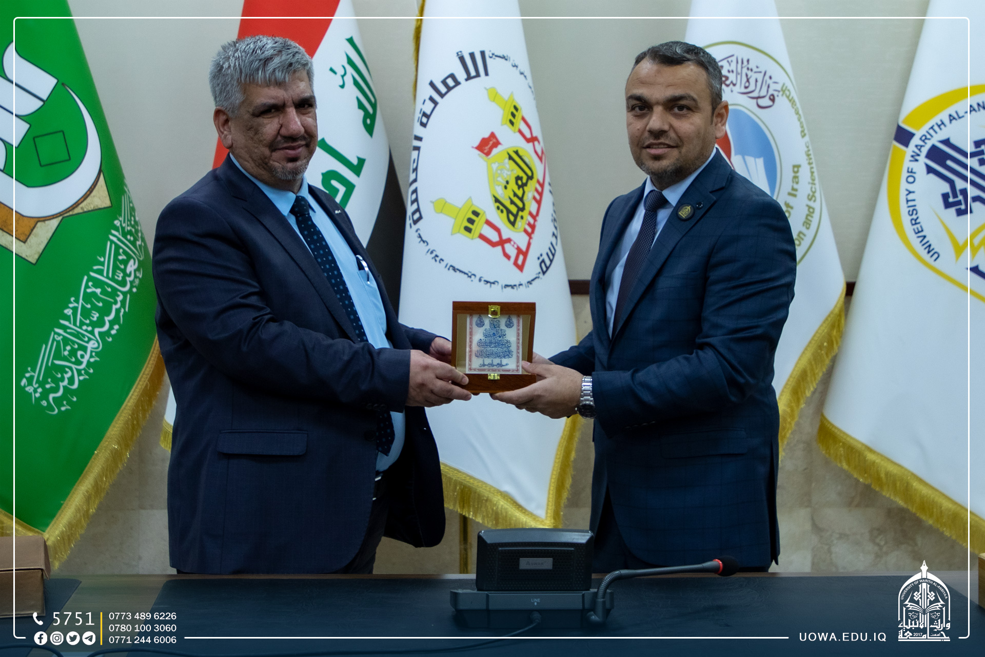 تشرفت جامعة وارث الأنبياء (عليه السلام) بزيارة مستشار الأمين العام للعتبة الحسينية المقدسة للشؤون الأمنية والاجتماعية جناب الحاج فاضل عوز وعضو مجلس ادارة العتبة المطهرة الحاج علي كاظم سلطان (دام توفيقهما).