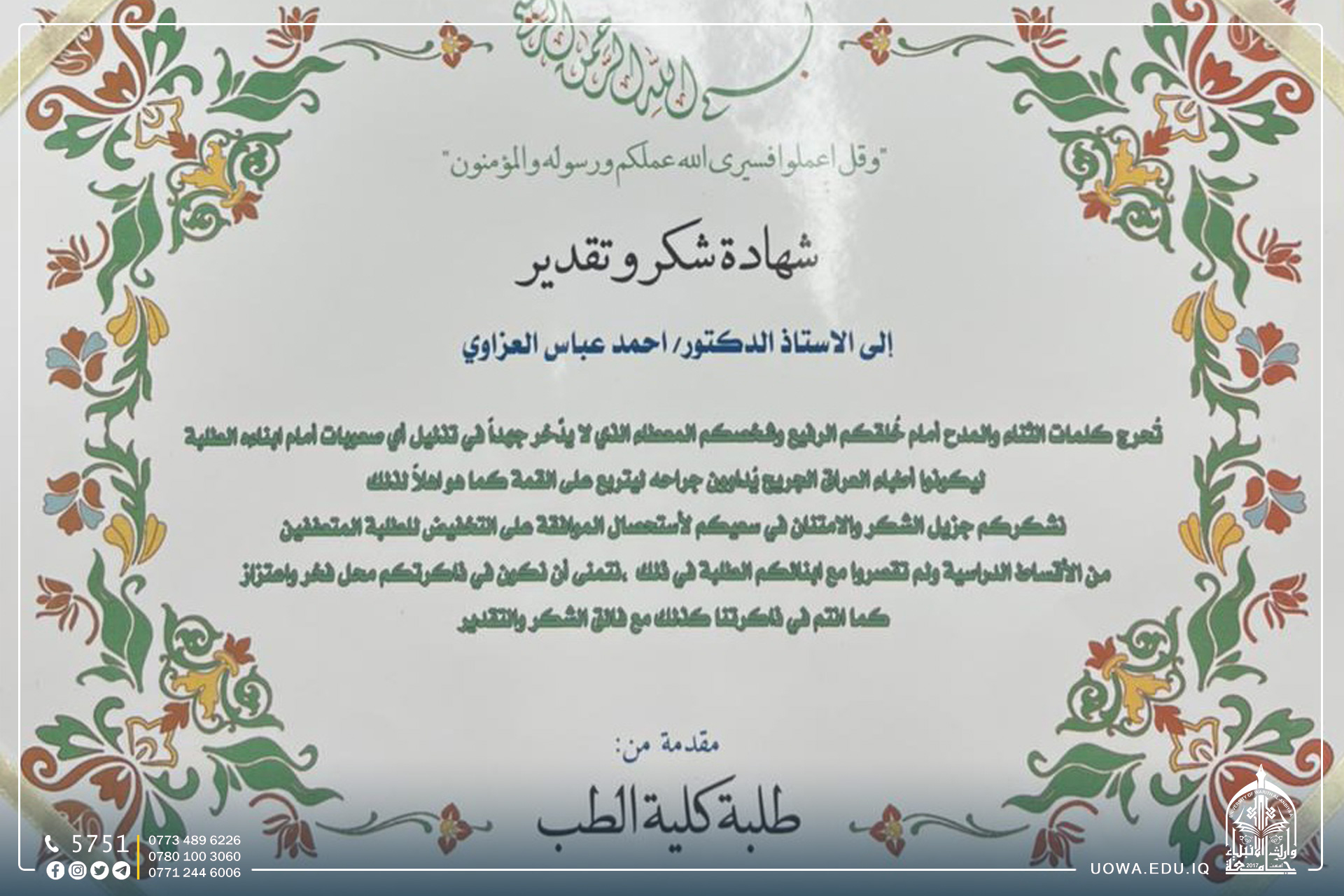 طلبة كلية الطب في جامعة وارث الانبياء (عليه السلام) يتقدمون بالشكر والتقدير الى السيد عميد الكلية الاستاذ الدكتوراحمد العزاوي لجهوده القيمة في دعم الطلبة وتذليل الصعاب امامهم.