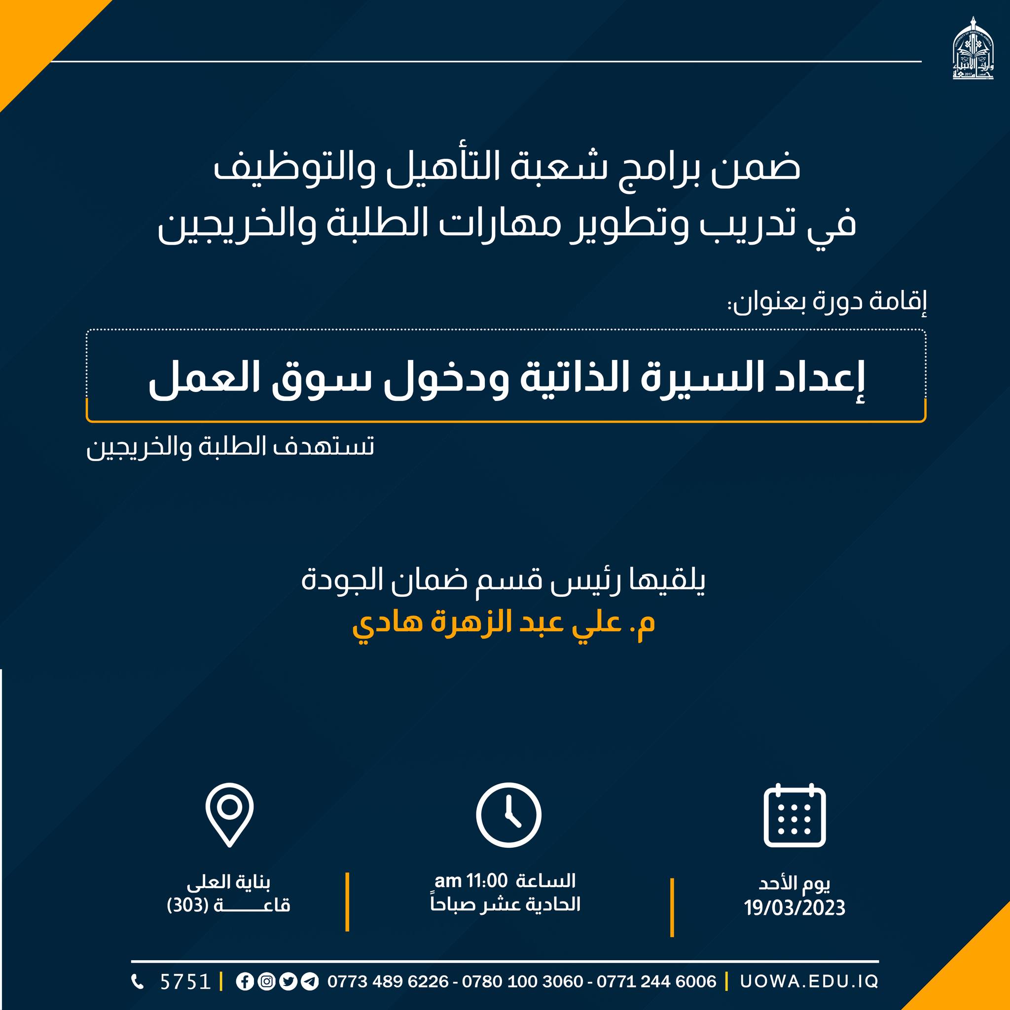 تلبية لرغبة خريجي جامعة وارث الانبياء(عليه السلام) لاستمرار دورة " اعداد السيرة الذاتية وكيفية الدخول الى سوق العمل" تقيم شعبة التأهيل والتوظيف دورة تدريبية لخريجي جامعتنا.