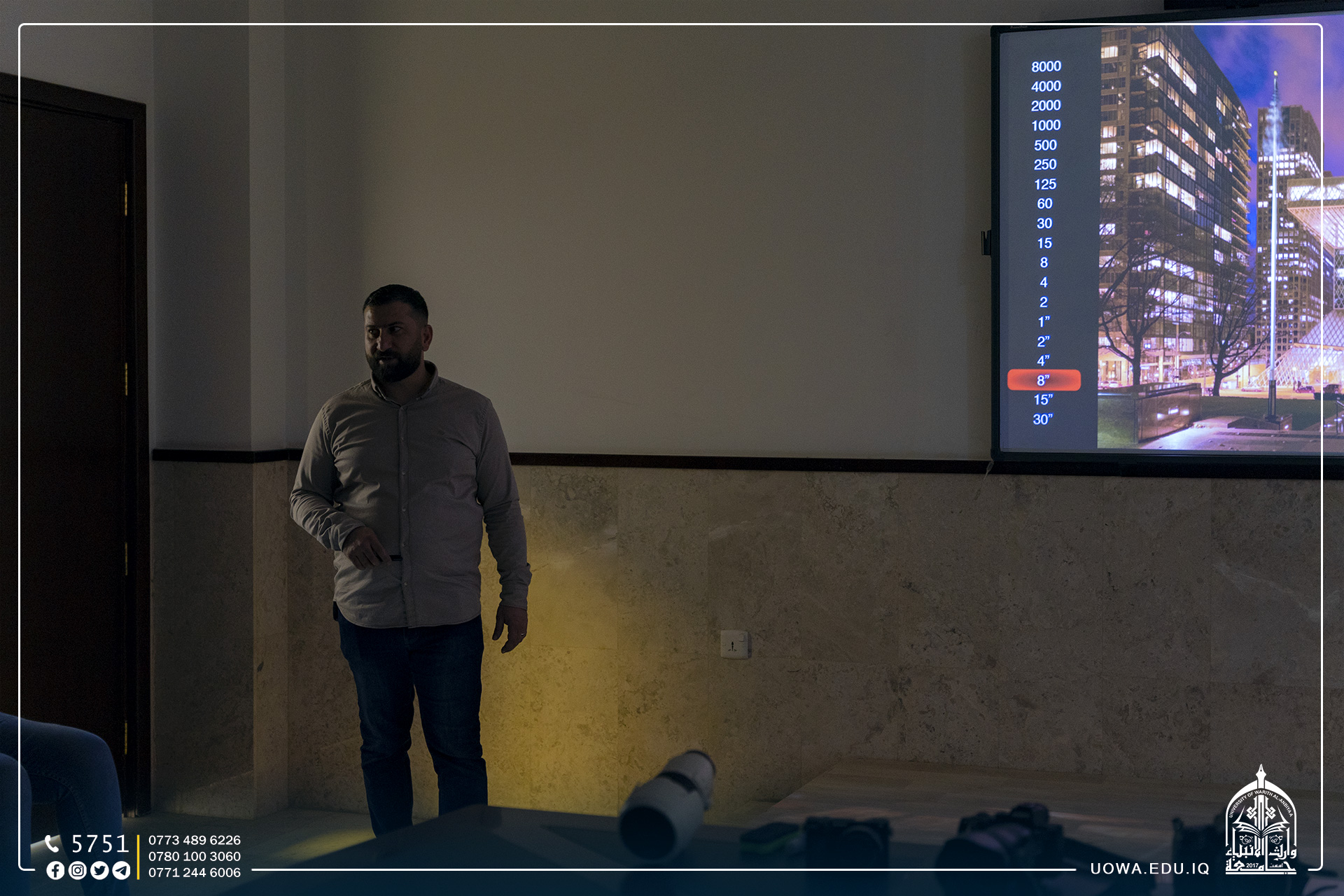 أقام قسم التعليم المستمر في جامعة وارث الانبياء (عليه السلام) وبالتعاون مع مركز الحاسبة الالكترونية دورة تدريبية بعنوان " التصوير الفوتوغرافي" قدمها المصور المحترف (ضياء عزيز الكلكاوي).