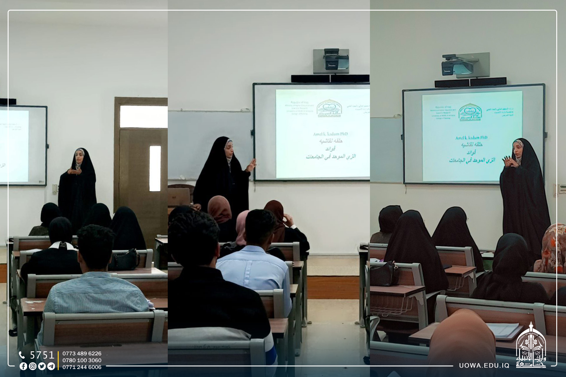 تولت ادارة الحوار التدريسيه م. د. امل خلف كاظم رئيسة فرع صحة الأم والطفل، بحضور مجموعة من طالبات الكلية.