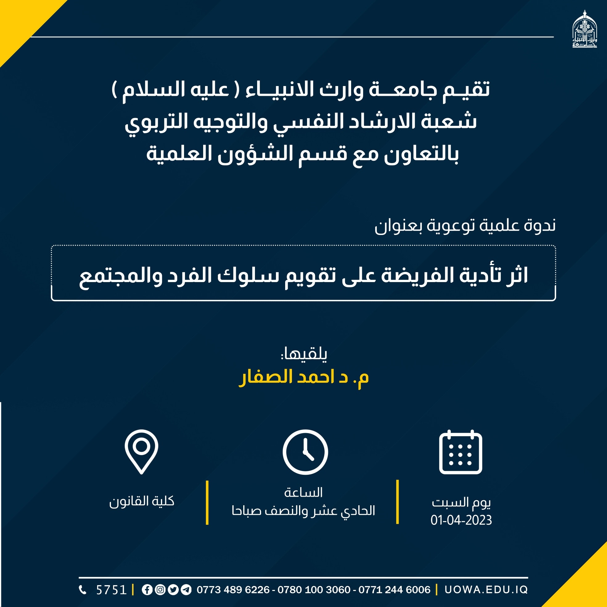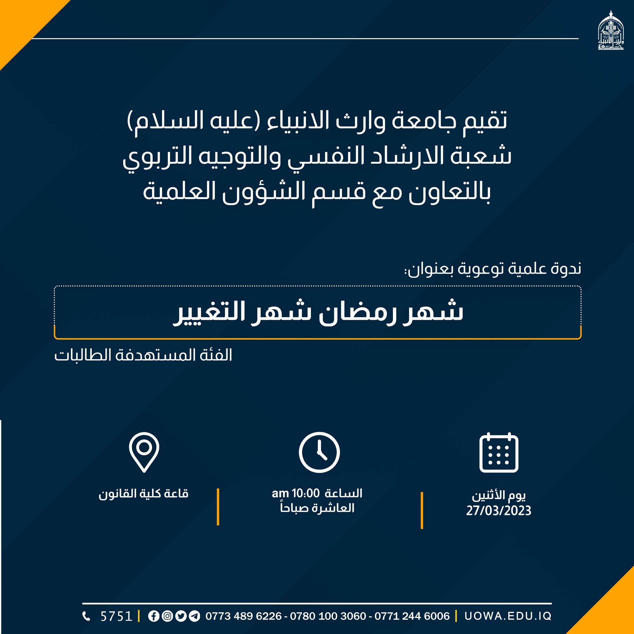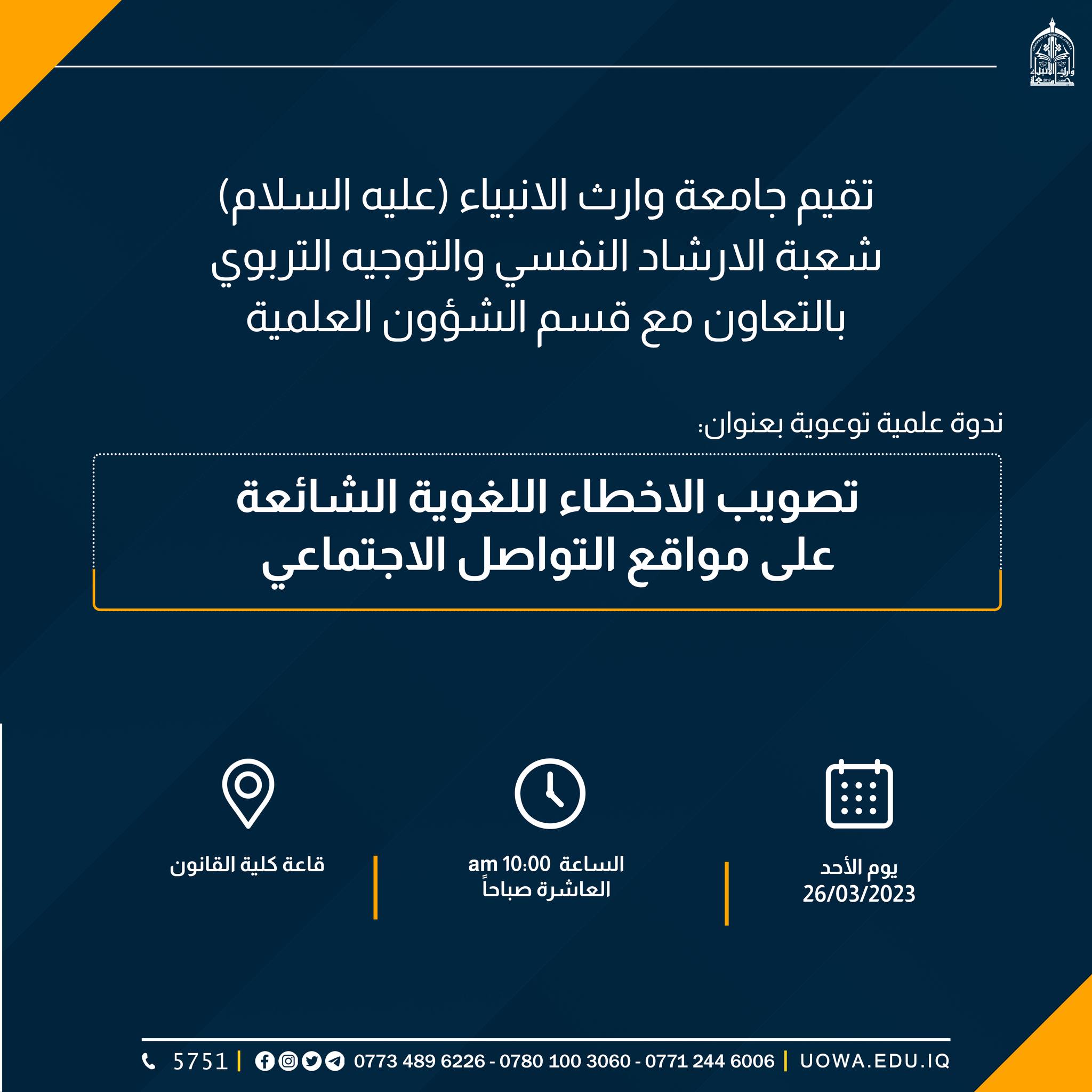 ندوة علمية توعوية بعنوان(تصويب الاخطاء اللغوية الشائعة على مواقع التواصل الاجتماعي)، أقامتها شعبة الارشاد النفسي والتوجيه التربوي في جامعة وارث الانبياء(عليه السلام) وبالتعاون مع قسم الشؤون العلمية