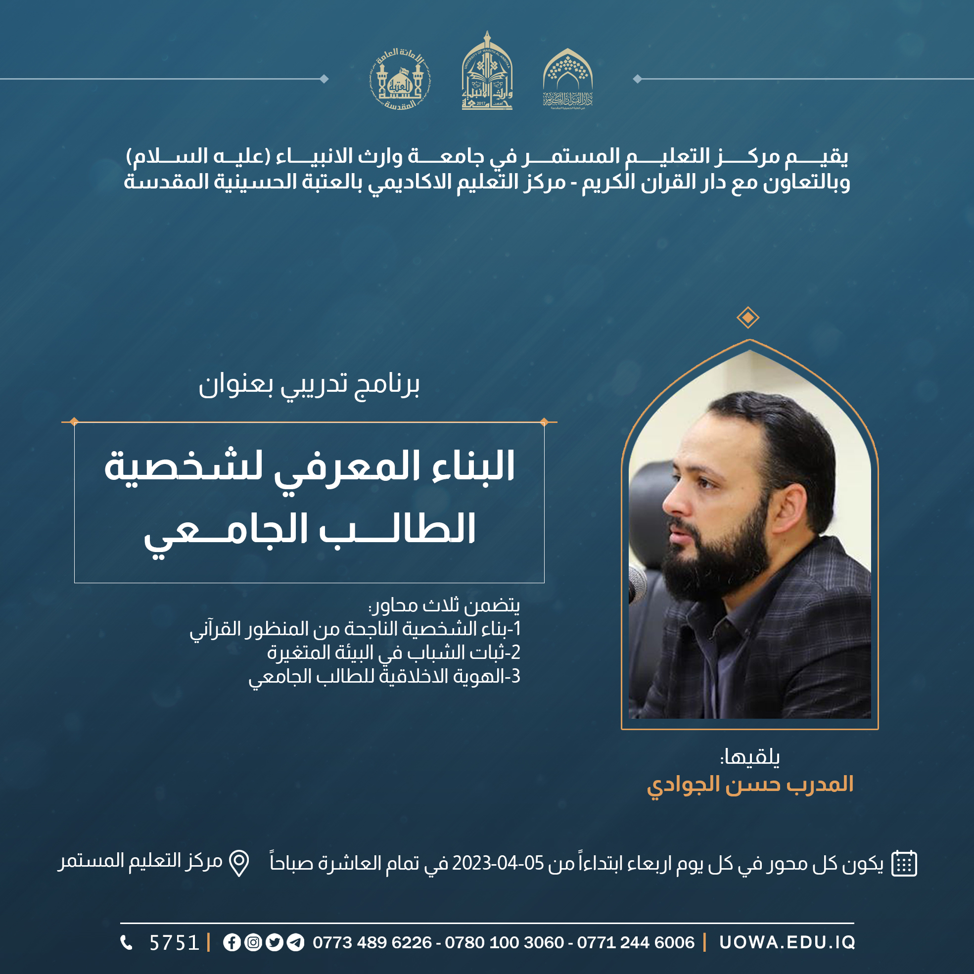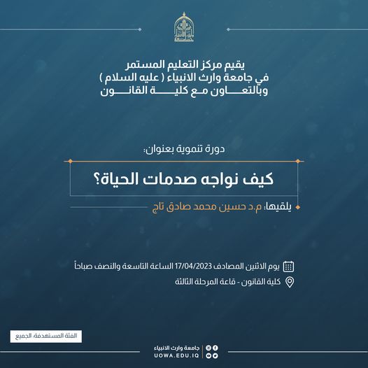 يقيم مركز التعليم المستمر بالتعاون مع كلية القانون في جامعة وارث الانبياء (عليه السلام)، دورة تنموية بعنوان "كيف نواجه صدمات الحياة"