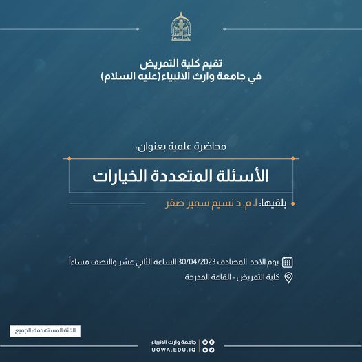 تقيم كلية التمريض في جامعة وارث الأنبياء (عليه السلام) محاضرة علمية بعنوان "الأسئلة المتعددة الخيارات"