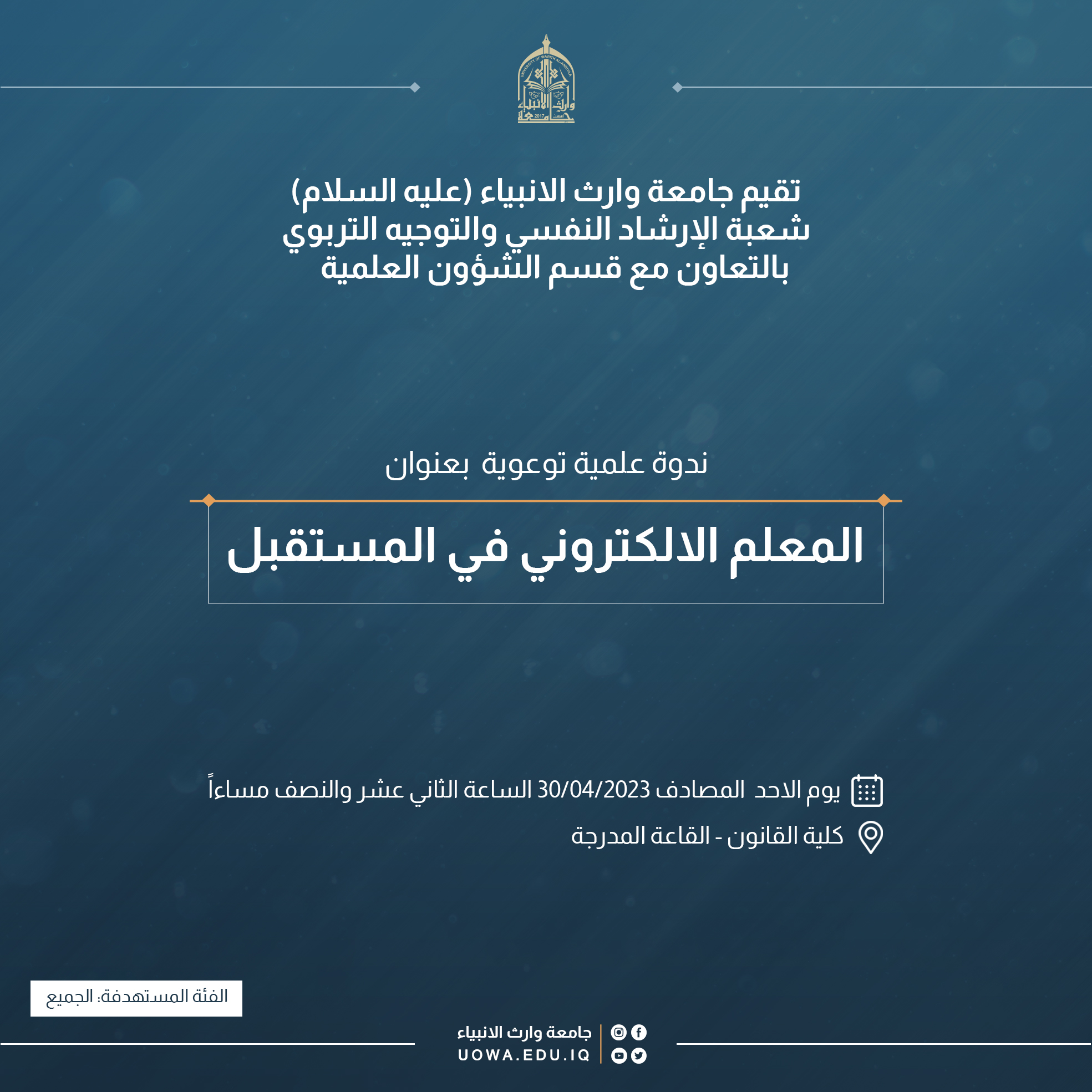 أقامت جامعة وارث (عليه السلام) / شعبة الارشاد النفسي والتوجيه التربوي مع قسم الشؤون العلمية، ندوة علمية توعوية بعنوان "المعلم الالكتروني في المستقبل"