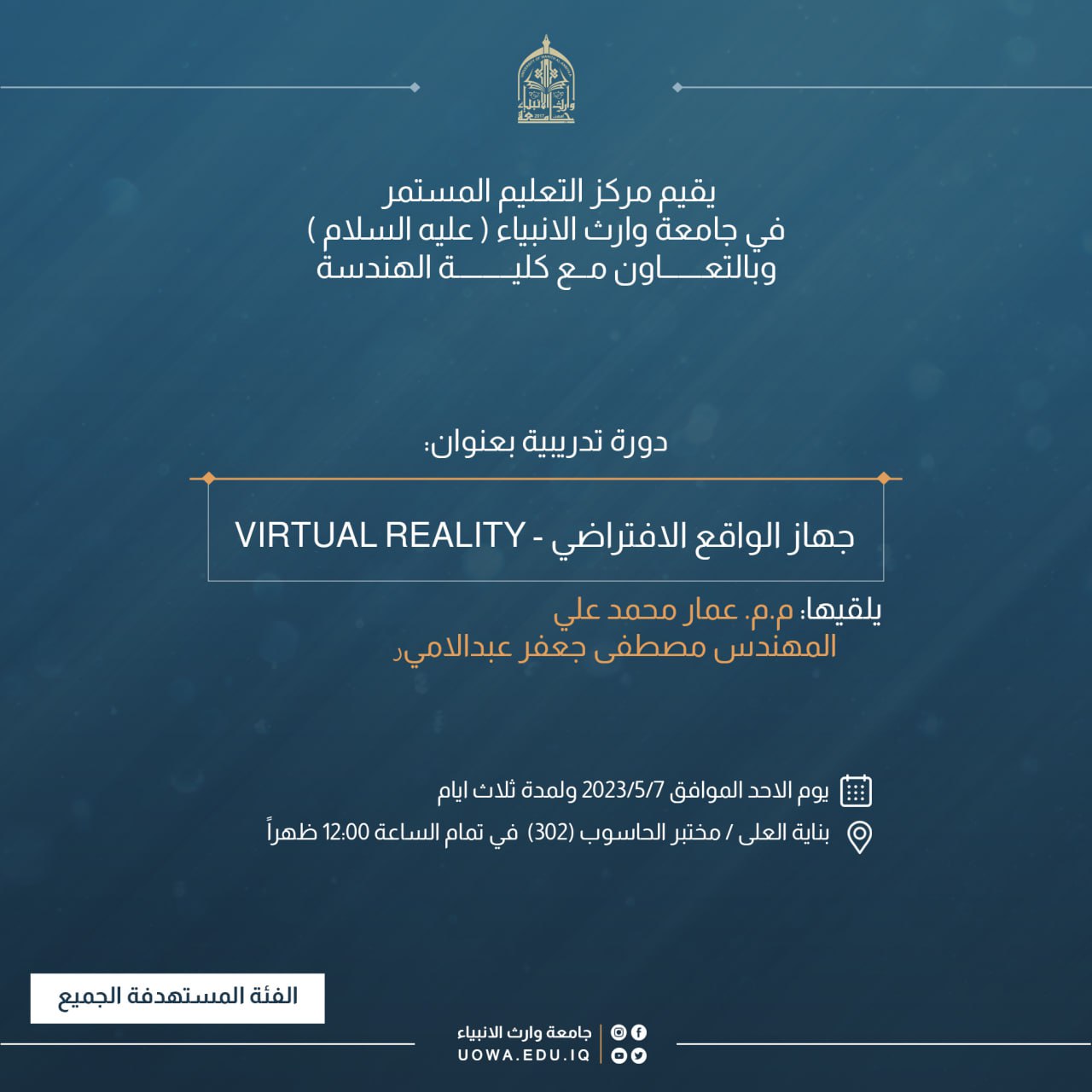 يقيم مركز التعليم المستمر في جامعة وارث الأنبياء (عليه السلام)، وبالتعاون مع كلية الهندسة دورة تدريبية بعنوان (جهاز الواقع الافتراضي)